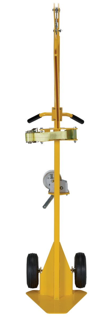 Steel Portable Cylinder Lifter with Pneumatic Wheels 300 Lb. Capacity YellowThis portable Cylinder lifter allows you to easily move and lift cylinders for placement into portable welders. Cylinder is secured to cart with manual ratchet strap. Cylinder is raised and lowered with manual hand crank cable winch. Portable with two (2) wheels. Steel construction with yellow baked-in powder-coated toughness.