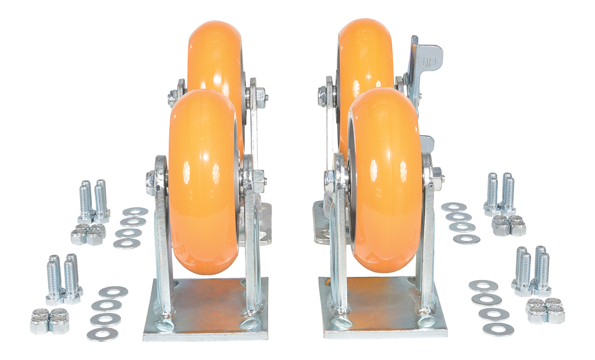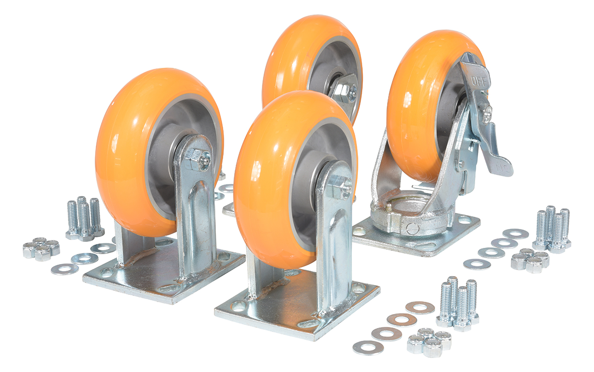 Elastic Polyurethane Caster Kit 6 in x 2 in 6000 lb Capacity ButterscotchConstructed of high-grade elastic Polyurethane and A robust Kingpinless rigging. Coupled with 6203 premium precision ball bearings for added strength and durability. The upgraded tread provides A longer life, reduces the force required for movement and offers exceptional floor preservation. 85 Shore A. wheel core is constructed of high-grade, light-weight, water resistant Aluminum. Made In Taiwan.