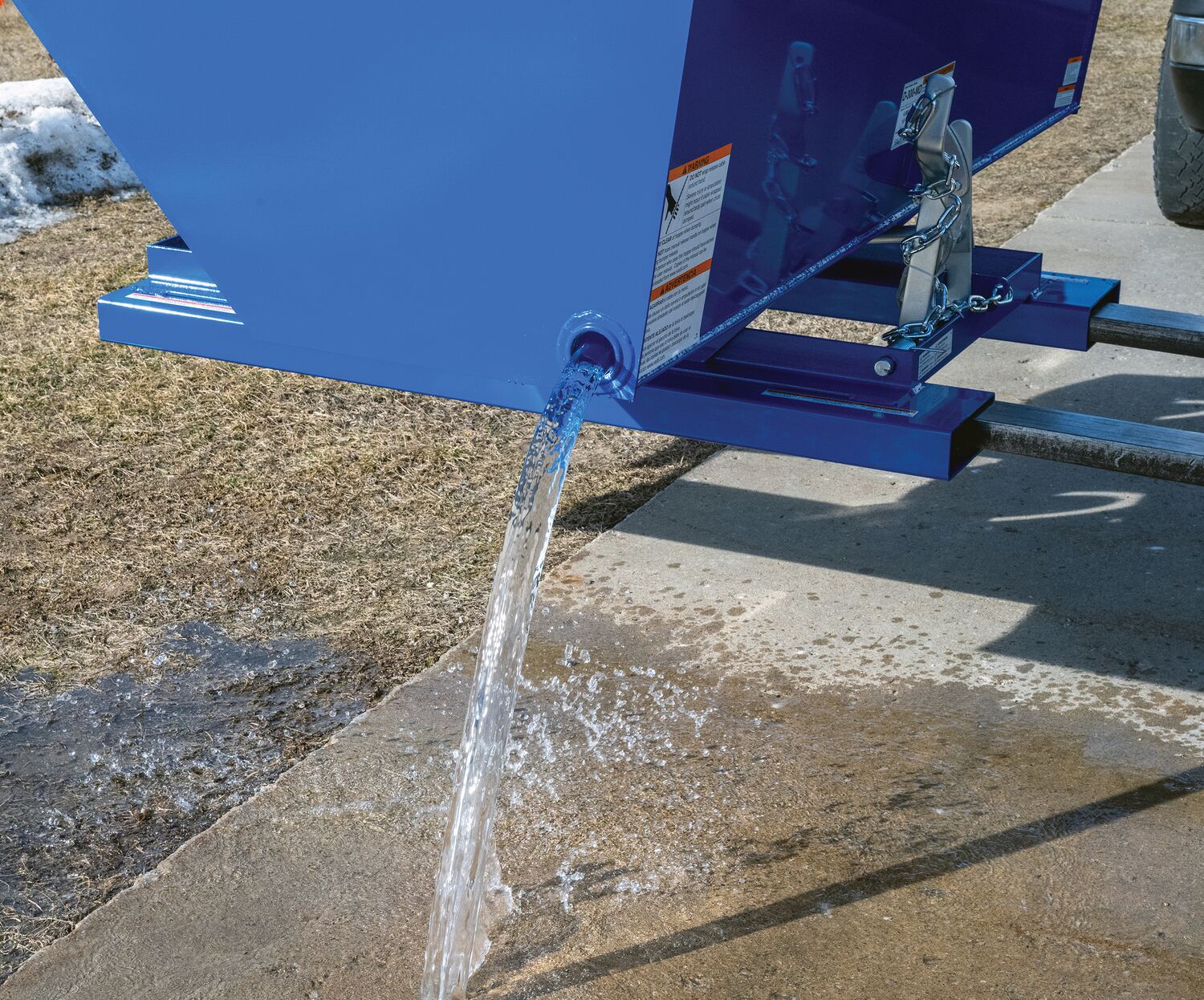 Threaded drain plug, located in left corner for D-style hopper, leak proof chute welds included.