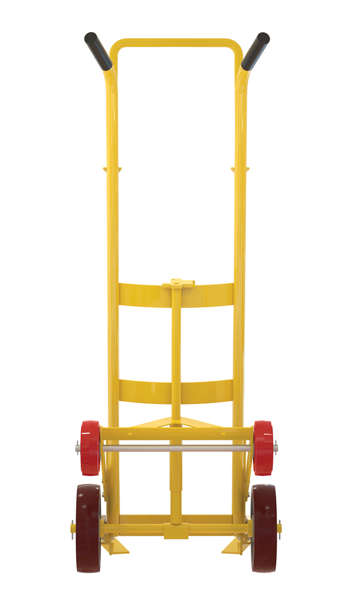 Designed for moving 55 gallon plastic drums. Features a spring mechanism, which allows for easier tilting of fully-loaded drums. Four-wheel design for easier drum transportation when tilted. Top loop handle allows for easier control when moving. Drum is secured to truck with an adjustable height drum hook bar. Removable drum hook bar includes built-in bung nut wrenches. Capacity is 1,000 pounds. Steel construction with powder coat finish.