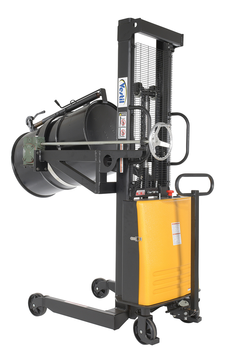 Steel DC Powered Drum Lifter/Rotator/Transporter 61 In. x 36-1/4 In. x 88 In. 550 Lb. Capacity Black/YellowA portable Drum Lifter/rotator/transporter has a DC battery powered lift operation and a manual hand crank gear mechanism rotation (on-board charger standard). For use with steel and fiber drums.