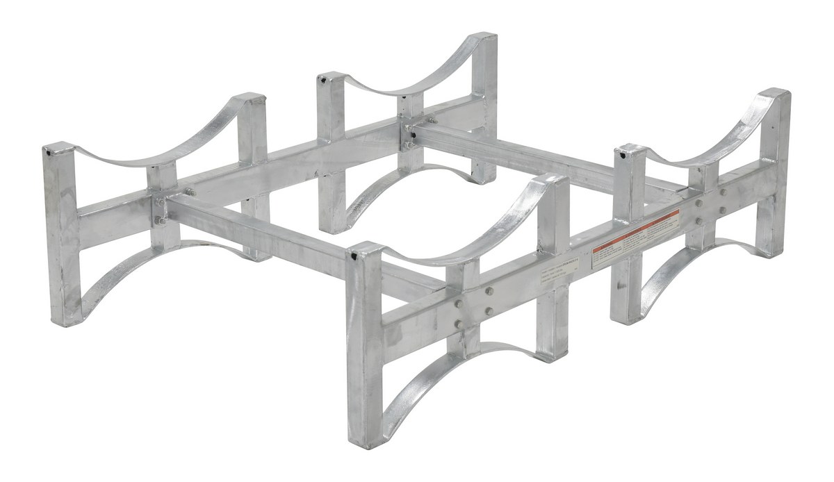 This steel drum rack has four-way fork truck access. Not recommended for stacking more than four (4) racks high. All steel construction with formed steel cradles. Bolt together assembly with hardware included.