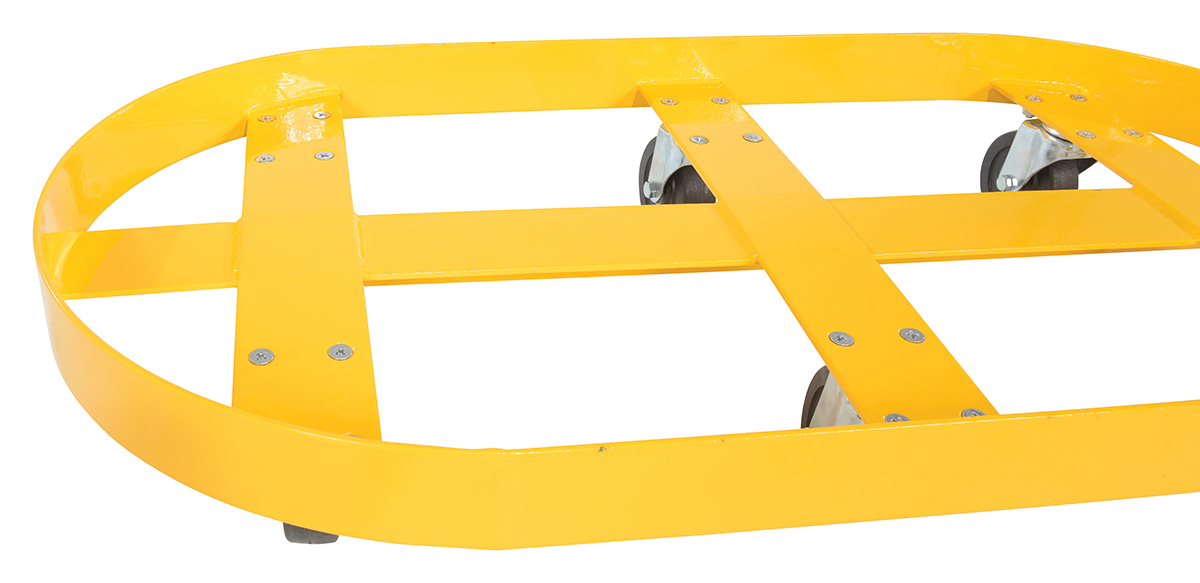 Steel Double Drum Dolly with Glass Filled Nylon Casters 45 In. x 45 In. x 39 In. Two 30 Gallon 2000 Lb. Capacity YellowA double drum cart is a revised look on an old classic. The double drum cart allows the user to transport two drums in a single load. This not only helps to save time, but it also minimizes the manual labor of handling individual drums. Six glass filled nylon casters add maneuverability and durability when traversing a variety of surfaces. Baked in powder coat finish for added long lasting toughness.