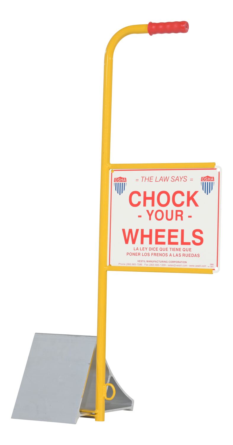 Aluminum Wheel Chock with Handle and Sign 7-11/16 In. x 20-11/16 In. x 37-1/16 In. Silver/YellowThe aluminum wheel chock is ideal for maintenance and industrial facilities. The chock is constructed of extruded lightweight aluminum that is easy to handle. The unit features a serrated top to grip the tire and a triple edged bottom to grip the ground. An extended handle with safety sign is included.