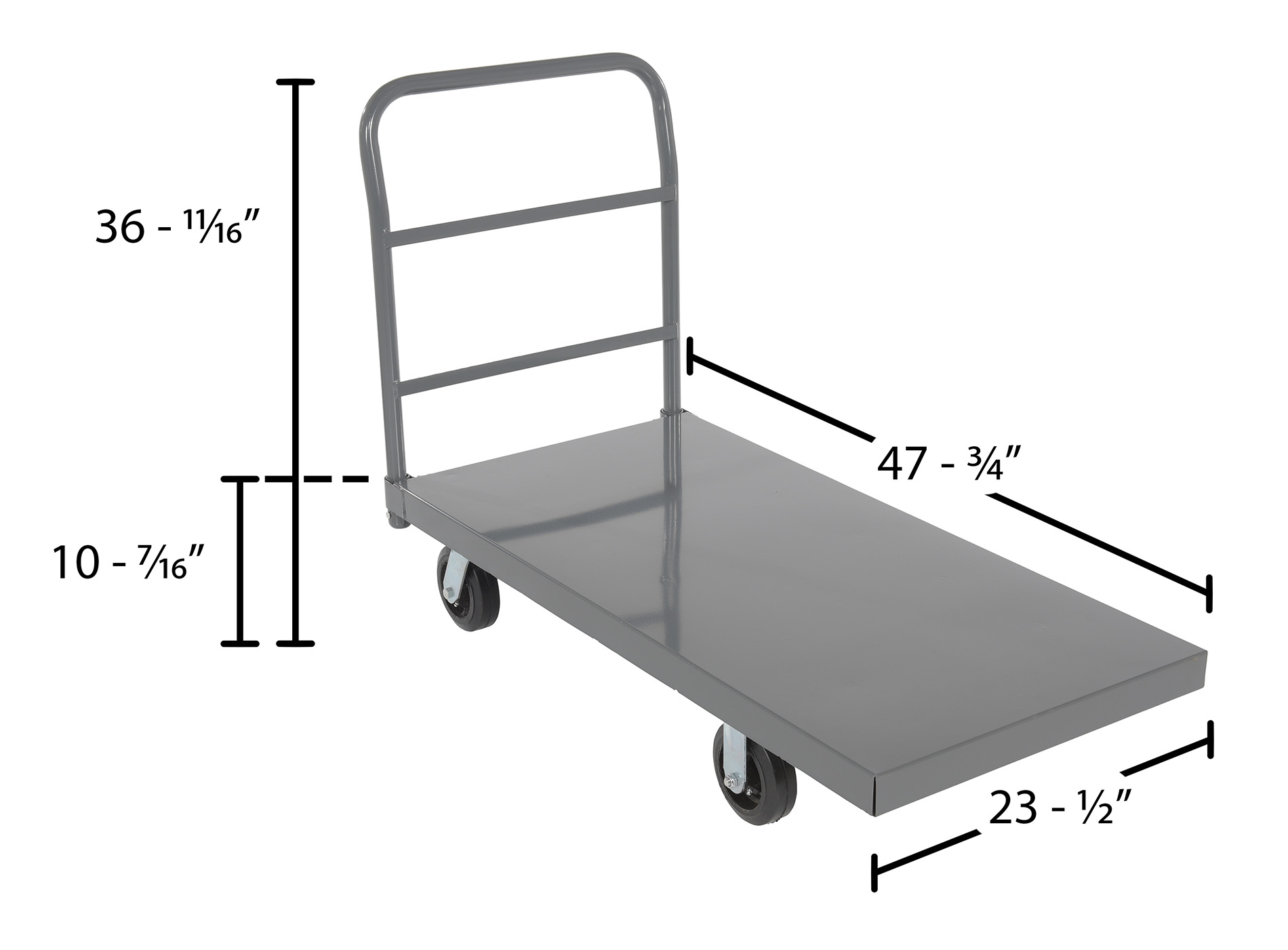 Steel Smooth Deck Platform Truck 24 In. x 48 In. 2000 Lb. Capacity BlackA steel platform truck is a perfect addition to any warehouse or shipping center. The steel platform design provides the user with a better sense of security. With a smooth surface, the amount of abrasion and scuffs during movement is limited. The steel handle allows the user to maintain an ergonomic posture while transferring goods. Mold on rubber casters roll smoothly. Powder coated finish provides added toughness.