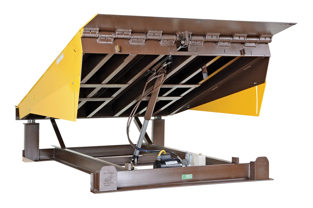 Steel Electric Hydraulic Dock Leveler 74"W x 86"L x 24"D Pit Dimensions, 25000 Lb. Capacity Brown/YellowThe electric hydraulic dock leveler is ideal for high usage dock areas. The hydraulic design is state of the art and consists of a single button operation. The operator pushes and holds the "raise" button which activates the hydraulic pump and raises the deck. When the deck reaches the raised position the lip automatically extends. The operator releases the "raise" button and the deck descends to rest on the trailer. The control box includes a red emergency stop button standard. When the truck pulls away, the deck descends to full down position, trips the limit switch and returns automatically to the level cross traffic position. It includes telescopic steel toe guards on both sides, flush with platform edge and includes two (2) laminated bumpers.