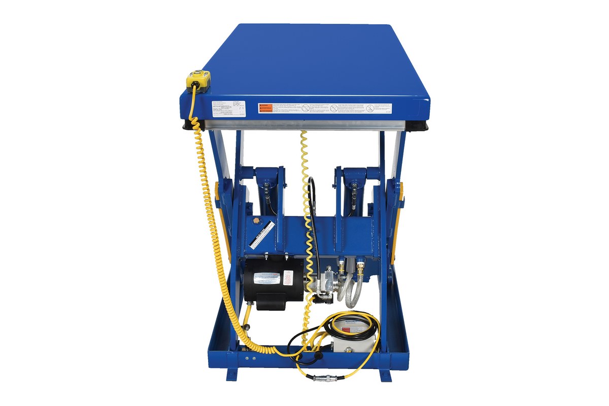 Steel Electric Hydraulic Lift Table 24 In. x 48 In. 4000 Lb. Capacity BlueThe electric hydraulic scissor lift table is used by all types of manufacturing and warehouse facilities. Safety features include a patented pinch point perimeter toe guard to protect pinch points while lowering the table, fused push button control, internal safety velocity fuse to maintain platform height in the event of hose or fitting failure, integral maintenance prop, adjustable upper travel limit switch to stop the table at maximum height, and displacement-style hydraulic cylinders for maximum strength. It also features a pressure plated pump, manifold system, and state-of-the-art lifetime lubricated bearings. The standard 56 frame electric motor is fully enclosed with additional voltage options available. Contact factory if platform dimensions are crucial.