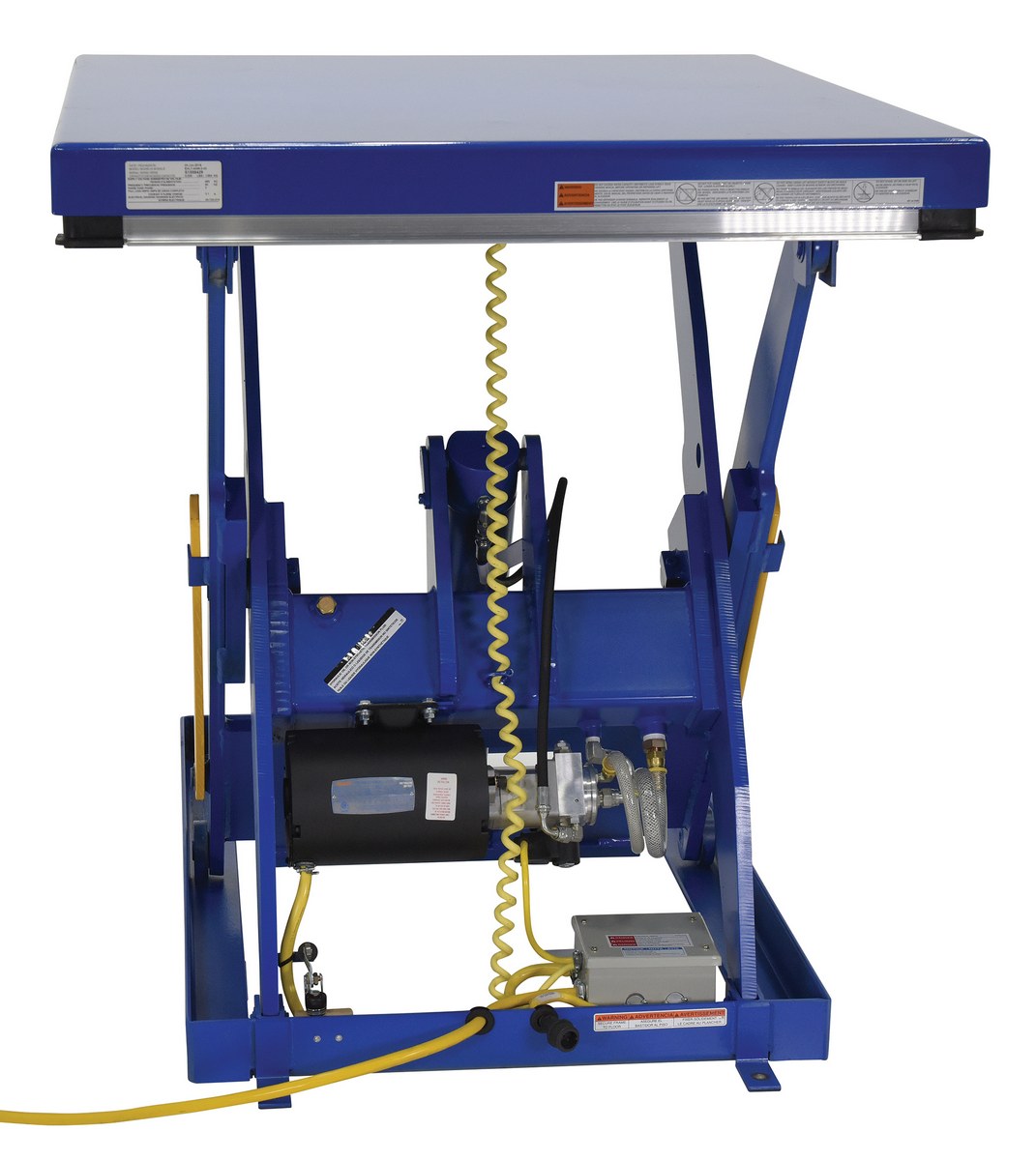 Steel Quick Ship Electric Hydraulic Lift Table 40 In. x 48 In. 3000 Lb. Capacity BlueThe electric hydraulic scissor lift table is used by all types of manufacturing and warehouse facilities. Safety features include a patented pinch point perimeter toe guard to protect pinch points while lowering the table, fused push button control, internal safety velocity fuse to maintain platform height in the event of hose or fitting failure, integral maintenance prop, adjustable upper travel limit switch to stop the table at maximum height, and displacement-style hydraulic cylinders for maximum strength. It also features a pressure plated pump, manifold system, and state-of-the-art lifetime lubricated bearings. The standard 56 frame electric motor is fully enclosed with additional voltage options available. Contact factory if platform dimensions are crucial.