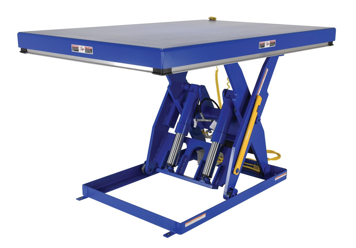 Steel Electric Hydraulic Lift Table 48 In. x 72 In. 5000 Lb. Capacity BlueThe electric hydraulic scissor lift table is used by all types of manufacturing and warehouse facilities. Safety features include a patented pinch point perimeter toe guard to protect pinch points while lowering the table, fused push button control, internal safety velocity fuse to maintain platform height in the event of hose or fitting failure, integral maintenance prop, adjustable upper travel limit switch to stop the table at maximum height, and displacement-style hydraulic cylinders for maximum strength. It also features a pressure plated pump, manifold system, and state-of-the-art lifetime lubricated bearings. The standard 56 frame electric motor is fully enclosed with additional voltage options available. Contact factory if platform dimensions are crucial.