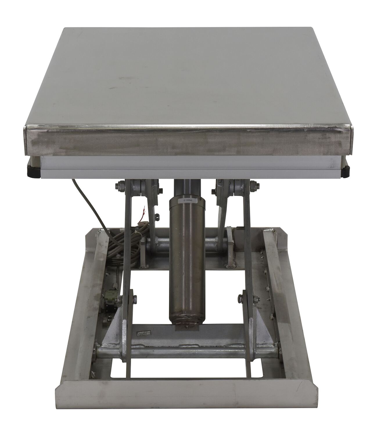 Partially Stainless Steel Work Station Electric Hydraulic Scissor Table 24 In. x 48 In. 1500 Lb. Capacity YellowThe work station electric hydraulic scissor table is designed to raise products up to an ergonomic working height. It maximizes safety with minimum space requirements and is ideal for all types of manufacturing and warehouse facilities. The external power unit can be located eight (8) feet away from the unit and comes with a standard hand control. An electric toe guard also comes standard with the unit.
