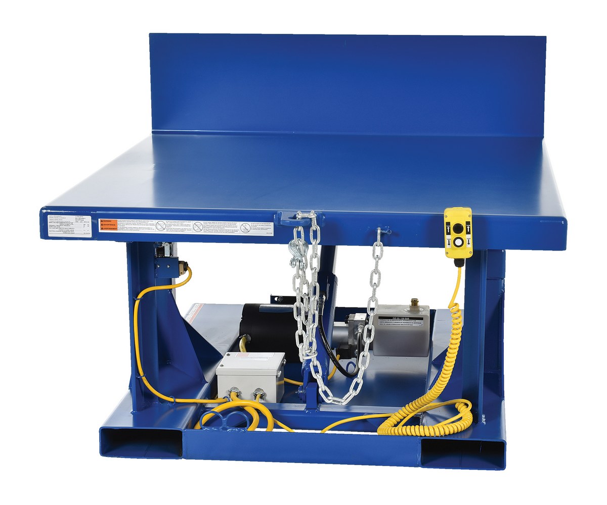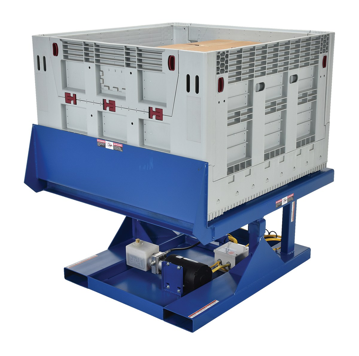 Steel Efficiency Master Tilt Table 48 In. x 48 In. 4000 Lb. Capacity BlueThe efficiency master tilt table tilts pallets, crates, boxes, or baskets to facilitate easy container loading or unloading. The table features all welded steel construction for years of durability. The unique design minimizes pinch points to meet OSHA requirements. This tilt table is equipped with an industrial quality motor that delivers the best torque with minimal amperage draw for maximum life. Standard voltage is 460/3PH, with additional voltage options available. The tilt table has a standard push button hand control. Base includes fork pockets for portability with forklift.
