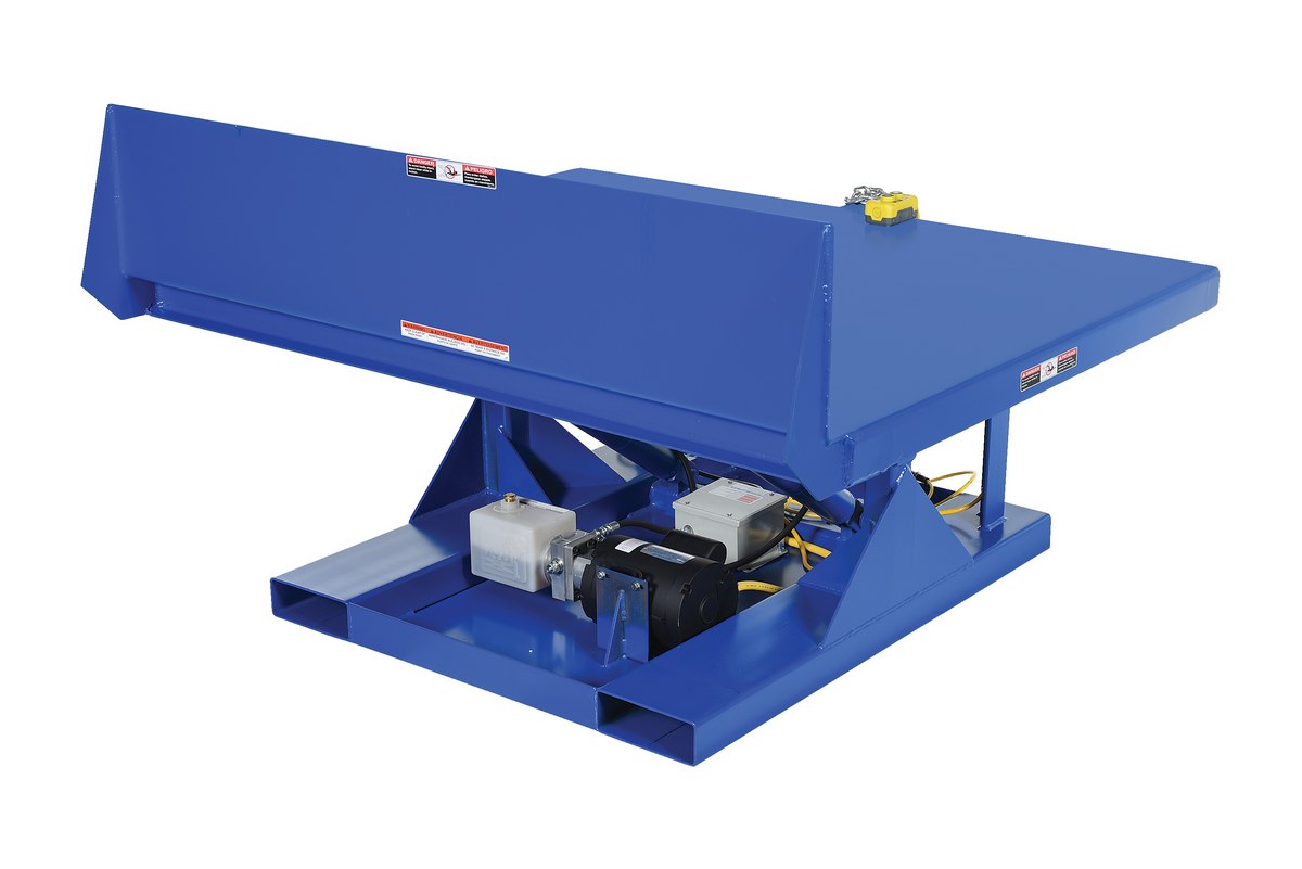 Steel Efficiency Master Tilt Table 60 In. x 50 In. 6000 Lb. Capacity BlueThe efficiency master tilt table tilts pallets, crates, boxes, or baskets to facilitate easy container loading or unloading. The table features all welded steel construction for years of durability. The unique design minimizes pinch points to meet OSHA requirements. This tilt table is equipped with an industrial quality motor that delivers the best torque with minimal amperage draw for maximum life. Standard voltage is 460/3PH, with additional voltage options available. The tilt table has a standard push button hand control. Base includes fork pockets for portability with forklift.
