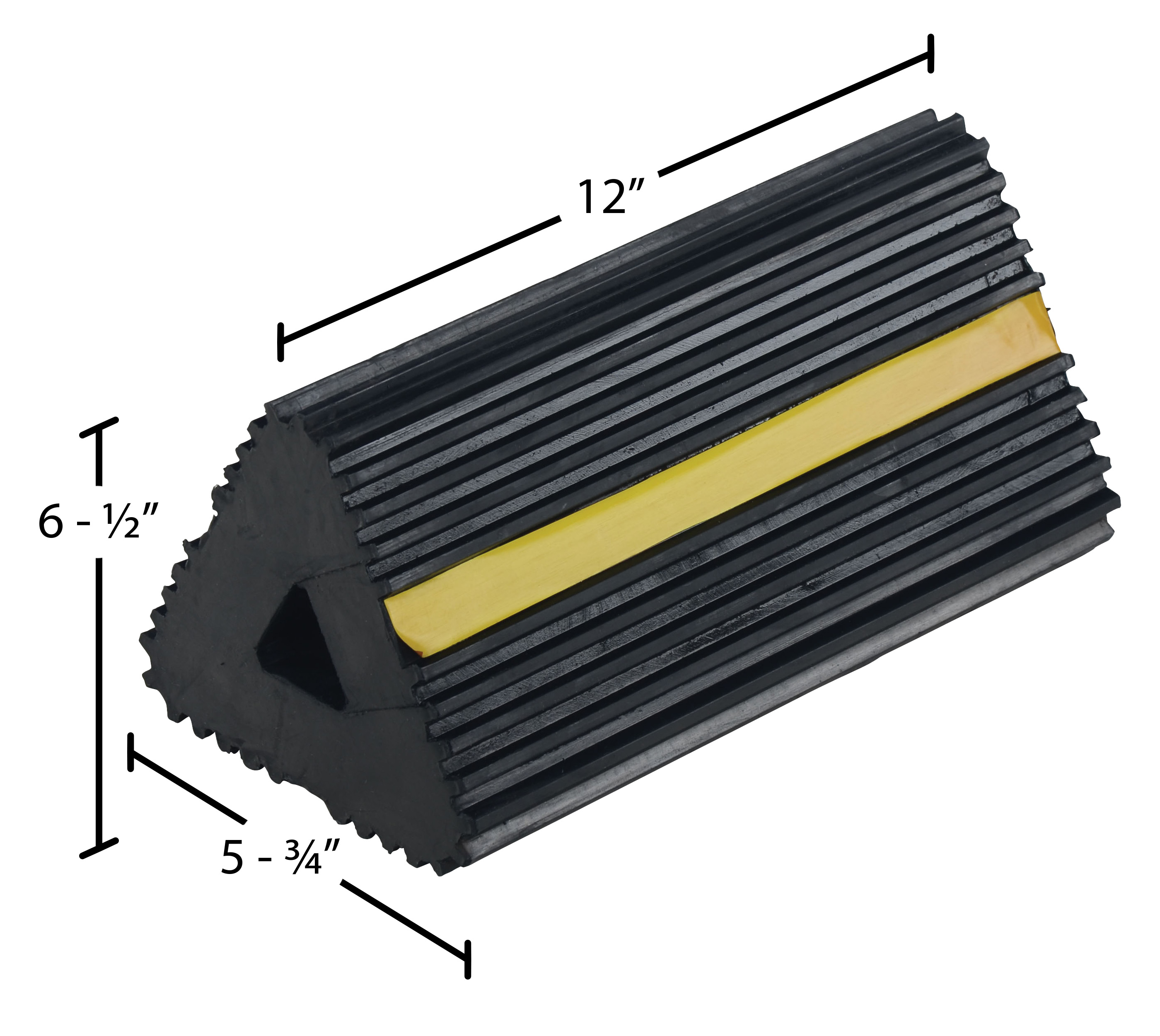 Extruded Rubber Wheel Chock 6-1/2 In. x 12 In. x 5-3/4 In. BlackThe rubber Wheel Chock is constructed of reinforced rubber to provide a sure grip on virtually any surface. The curved surface contours to fit tires. Rubber resists tearing, abrasion, ozone weathering, etc. The functional design is durable in all weather conditions.