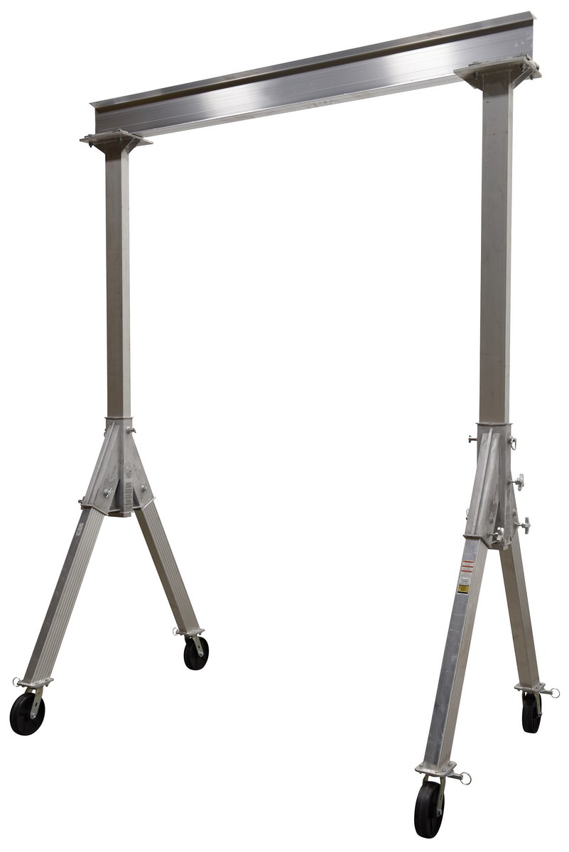 Aluminum Fixed Gantry Crane with Glass Filled Nylon Locking Casters 10 Ft. x 10 Ft. 2000 Lb. Capacity SilverThe fixed height Aluminum Gantry cranes are ideal for the manufacturing and maintenance facilities. The aluminum construction is easily manageable and can be simply assembled for immediate use. The unit has a fixed height for working in a permanent or semi-permanent environment. The casters allow the user to move the crane from workstation to workstation and smoothly roll over rough surfaces, while not marring. Do not move units while loaded.