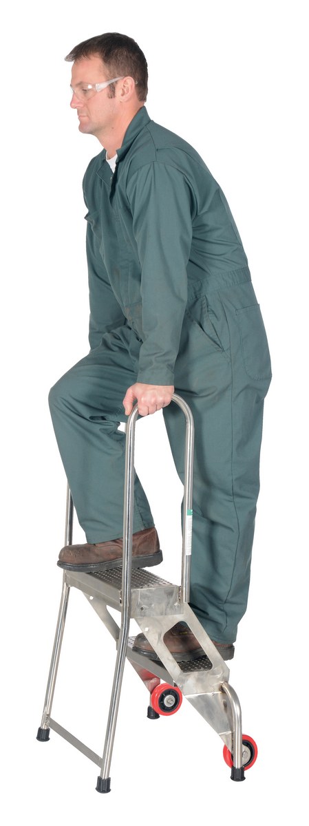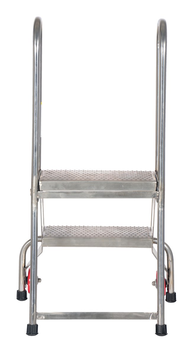 Stainless Steel Folding Ladder with Wheels 2 Step 350 Lb. Capacity BlueThe folding ladder with wheels has a locking foldable design that saves on storage space when ladder is not in use. Ladder folds after unlocking spring-loaded detent pin. Once unit is folded, tilt back on wheels for easy portability. Ladder is carbon steel. The steps are perforated to provide a non-slip surface.