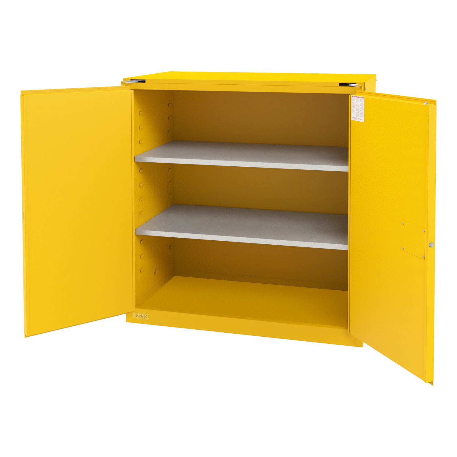 Flammable Self Closing Storage Cabinet 120 Gallon Capacity YellowKeeping dangerous items safe is always a priority. Built to help with that safety is the flammable storage cabinet. A fully welded, double wall steel construction has the durability and strength that many standard cabinets just don't have. One of the best examples of the tremendous care that goes into each and every cabinet is the grounding aid. Each cabinet is equipped with an electrical ground to eliminate any electrostatic discharge. Another often over looked feature is the two inch leak proof base. This base neatly corrals any material or substances that may have escaped their original containers. Each cabinet comes assembled and prepared to keep you and your workplace safe!