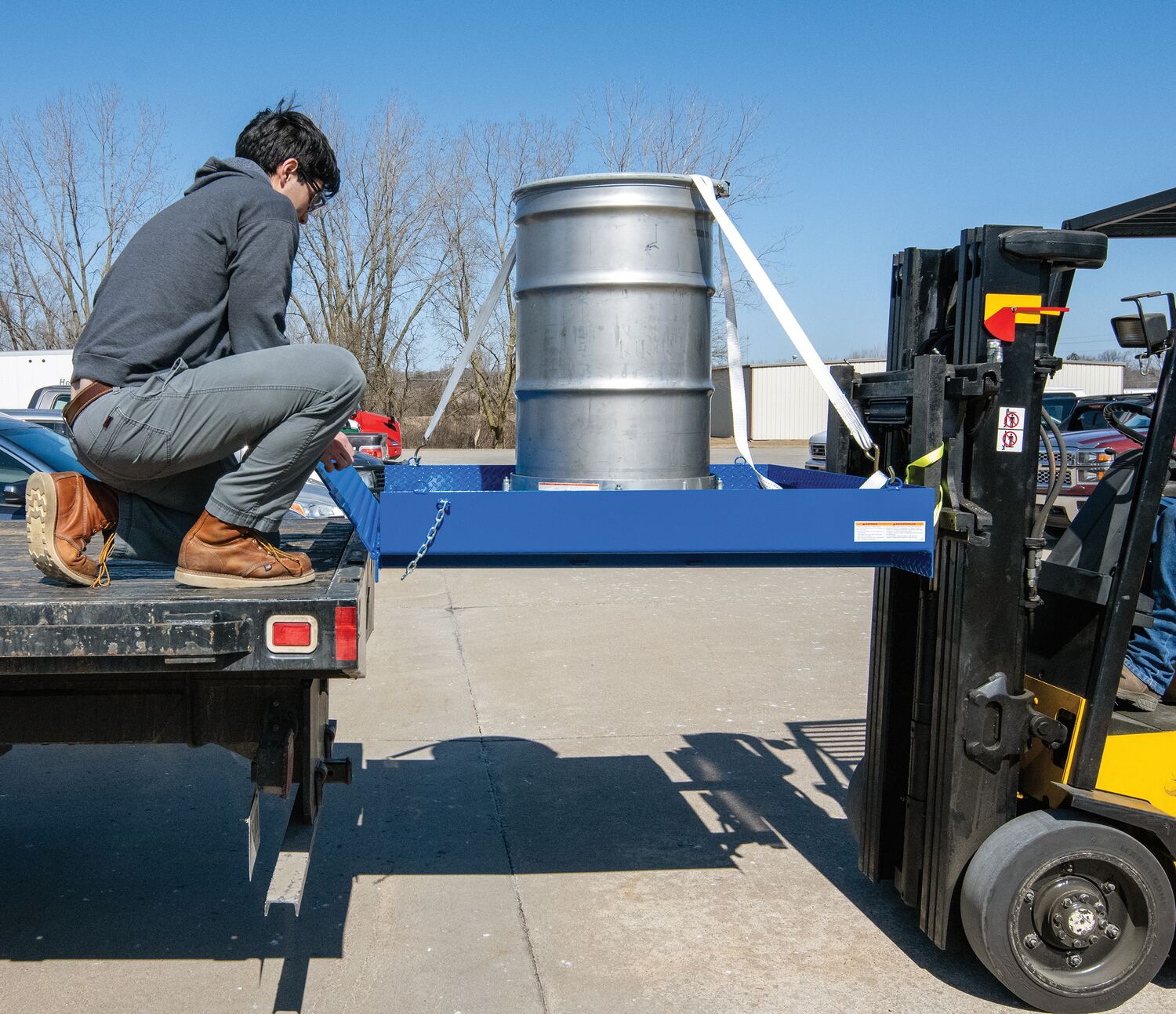 Steel Economical Portable Loading Platform 54 In. x 54 In. 2000 Lb. Capacity BlueThis loading platform for fork trucks allows fork trucks to load/unload items into trucks and trailers. Maximum uniform weight capacity is dependent on fork truck capacity. Includes fold-down lip to help with transition. Side guard toe boards. Four (4) tie-down rings are included for securing equipment (tie downs not included). Diamond tread plate floor for extra traction. Safety strap (included) to secure platform to fork truck. Steel construction with baked-in powder-coated toughness.