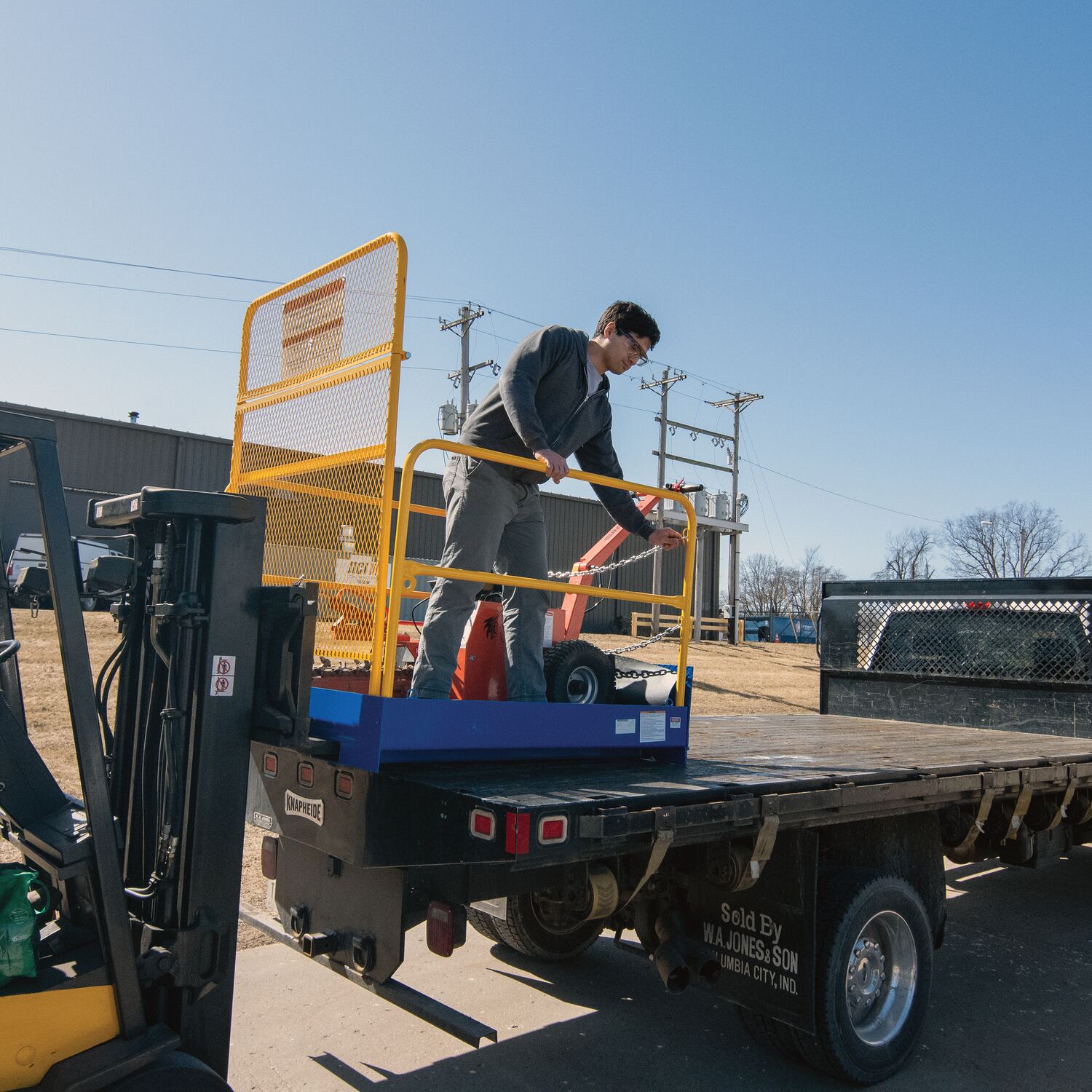 This loading platform for fork trucks allows fork trucks to load/unload items into trucks and trailers. Maximum uniform weight capacity is dependent on fork truck capacity. Includes fold-down lip to help with transition. Side guard toe boards. Four (4) tie-down rings are included for securing equipment (tie downs not included). Diamond tread plate floor for extra traction. Handrails on two (2) sides, back mesh screen and chain to secure open end. safety strap (included) to secure platform to fork truck. Steel construction with blue baked-in powder-coated toughness.