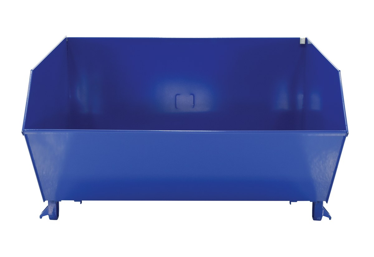 Steel Medium Duty Low Profile Self Dumping Hopper 1 Cubic Yard 4000 Lb. Capacity BlueThe Medium Duty Low Profile 90 degree self-dumping steel Hopper feature a full ninety (90) degree dump angle with a cushioned rubber bumper stop. The low profile design is essential for convenient loading. Dumping with a fork truck is quick and simple. A cable is pulled from the seat of the fork truck to dump the hopper. The unit returns to an upright and locked position when lowered to the ground. Fork pockets are 22" long and are capped on the end to allow for 90 degrees dump. The included safety restraint/chain must be securely attached to the lift truck carriage without slack. Models with same overall width may be stacked. For example, models H-25 may be stacked with H-50’s, the H-100’s can be stacked with H-150’s, while the H-200 hoppers can only be stacked with other H-200 series models. Never stack hoppers more than 3 high.