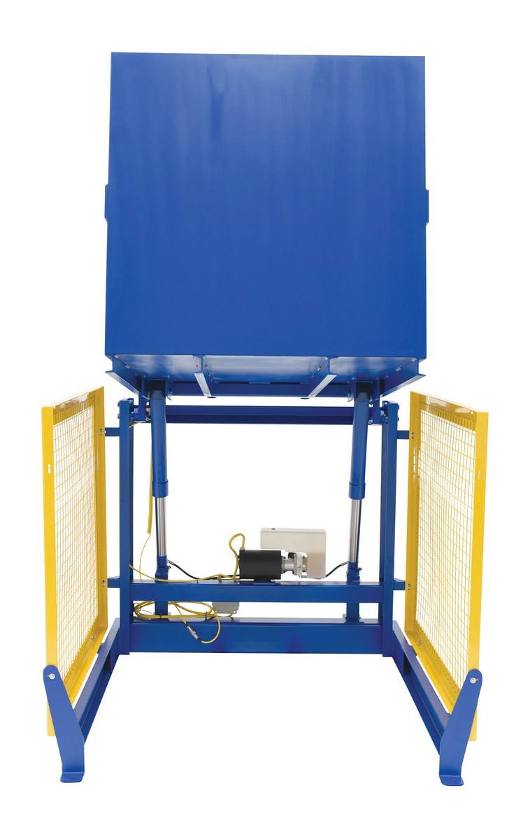 Steel Electric Hydraulic Box Dumper 48 In. Dump Height 2,000 Lb. Capacity BlueThe electric/Hydraulic box dumper is designed for controlled dumping of material from boxes, crates, and other types of containers. It is designed for pallet truck loading and unloading. The retaining bar adjusts to accommodate a wide range of container heights. Each dump height has a hold down range and an internal power unit with a hand held control standard. It has a heavy-duty welded steel construction with protective mesh side screens included.