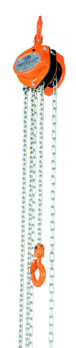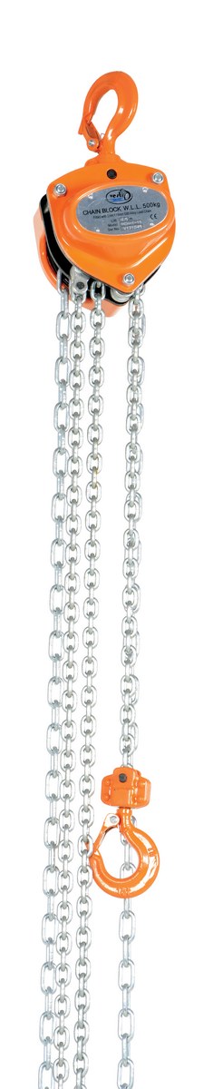 Steel Manual Chain Hoist 15 Ft. Lift 1,000 Lb. Capacity OrangeThis portable, lightweight hand Chain Hoist is durable and easy to operate. Compact design and low headroom allow installation in confined areas. Enclosed double ratchet pawls with self adjusting disc brake standard. Designed with a safety factory four (4) times rated capacity. Individually tested at 150% rated capacity. Features black chain tempered to ISO 3077, pull chain, hardened two-stage gears and forged steel upper and lower hooks with safety latches. Constructed of high quality steel components ideal for industrial applications.