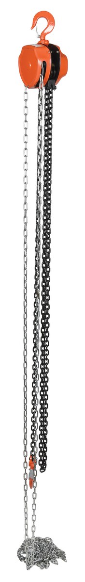 Steel Manual Chain Hoist 15 Ft. Lift 2,000 Lb. Capacity OrangeThis portable, lightweight hand Chain Hoist is durable and easy to operate. Compact design and low headroom allow installation in confined areas. Enclosed double ratchet pawls with self adjusting disc brake standard. Designed with a safety factory four (4) times rated capacity. Individually tested at 150% rated capacity. Features black chain tempered to ISO 3077, pull chain, hardened two-stage gears and forged steel upper and lower hooks with safety latches. Constructed of high quality steel components ideal for industrial applications.
