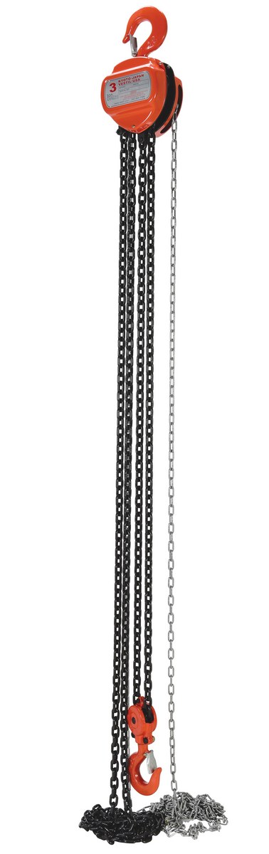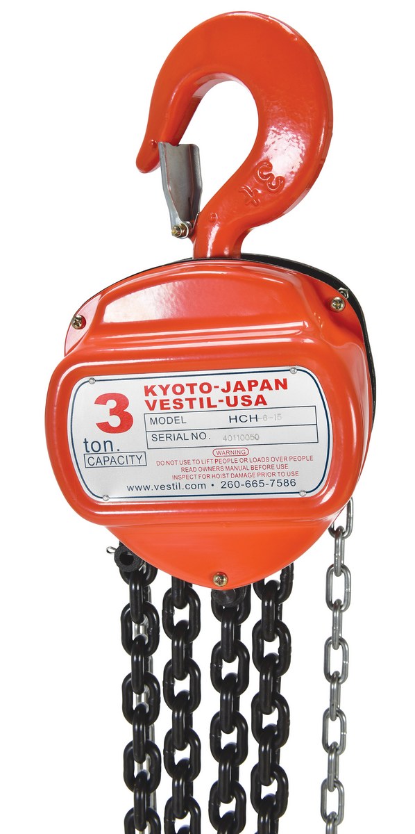 Steel Manual Chain Hoist 15 Ft. Lift 6,000 Lb. Capacity OrangeThe hand chain hoists are ideal for industrial applications. The hoist is light weight, ergonomically friendly to handle, and designed for comfortable use in low headroom /confined areas or work. Features include a pull chain with upper and lower hooks constructed of forged steel for additional strength and hardened two stage gears for a quicker pulling time.