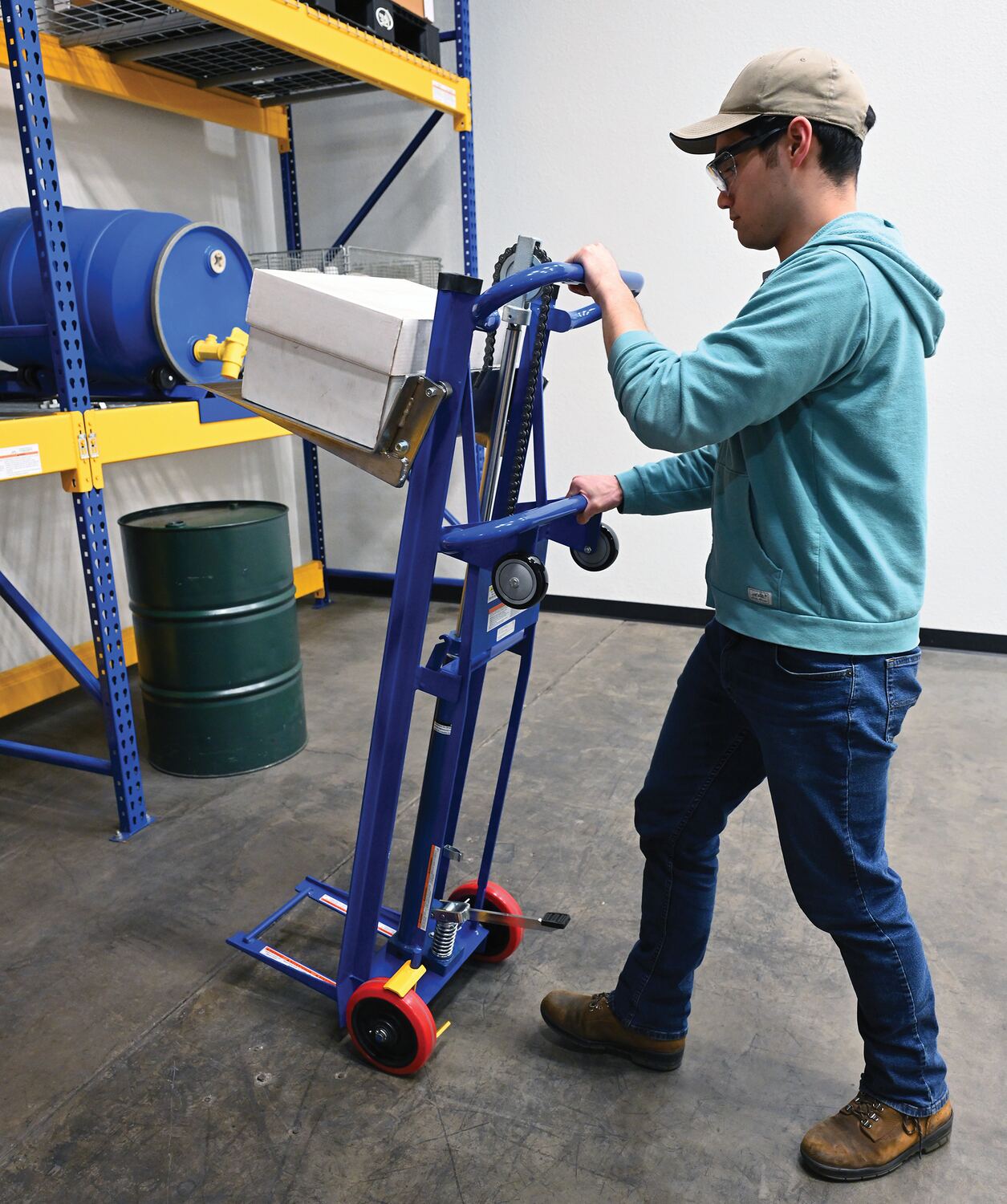 Steel Hydra Lift Cart 20 In. x 16-3/16 In. 750 Lb. Capacity BlueThe hydra cart transports loads in the lowered position and maneuver work materials to an ergonomic height, which is ideal in compact work areas. It's safe and easy for one person handling of loads and an efficient way to unload heavy objects from semi-trailers. The rugged steel construction allows for many years of service. The dependable precision built hydraulic system is activated by an easy action foot lever. The additional rollers on the handle make loading into a delivery truck easy. A single wheel brake comes standard.
