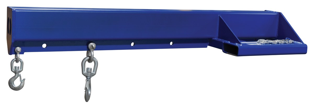 Steel Economy Non Telescoping Lift Boom 24 In. Fork Pocket Center 8,000 Lb. Capacity Blue and YellowUnique performance, convenience, and safety features are built into every lift master boom. Fabricated from structural steel with welding to meet AWS creates a rugged and durable boom that will provide long term service. A safety restraint secures the boom to the fork truck for safe operation. Includes two (2) lifting hooks.