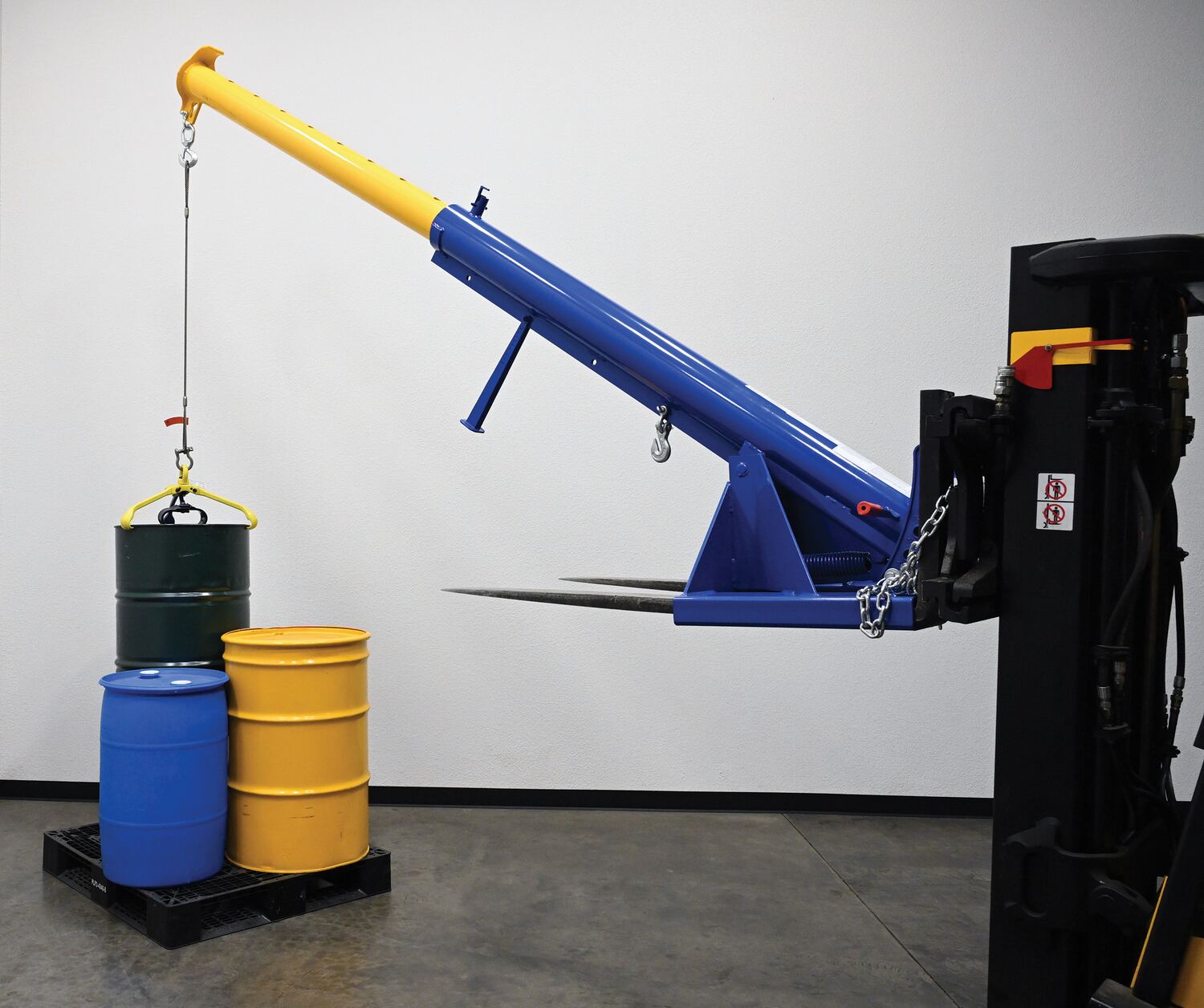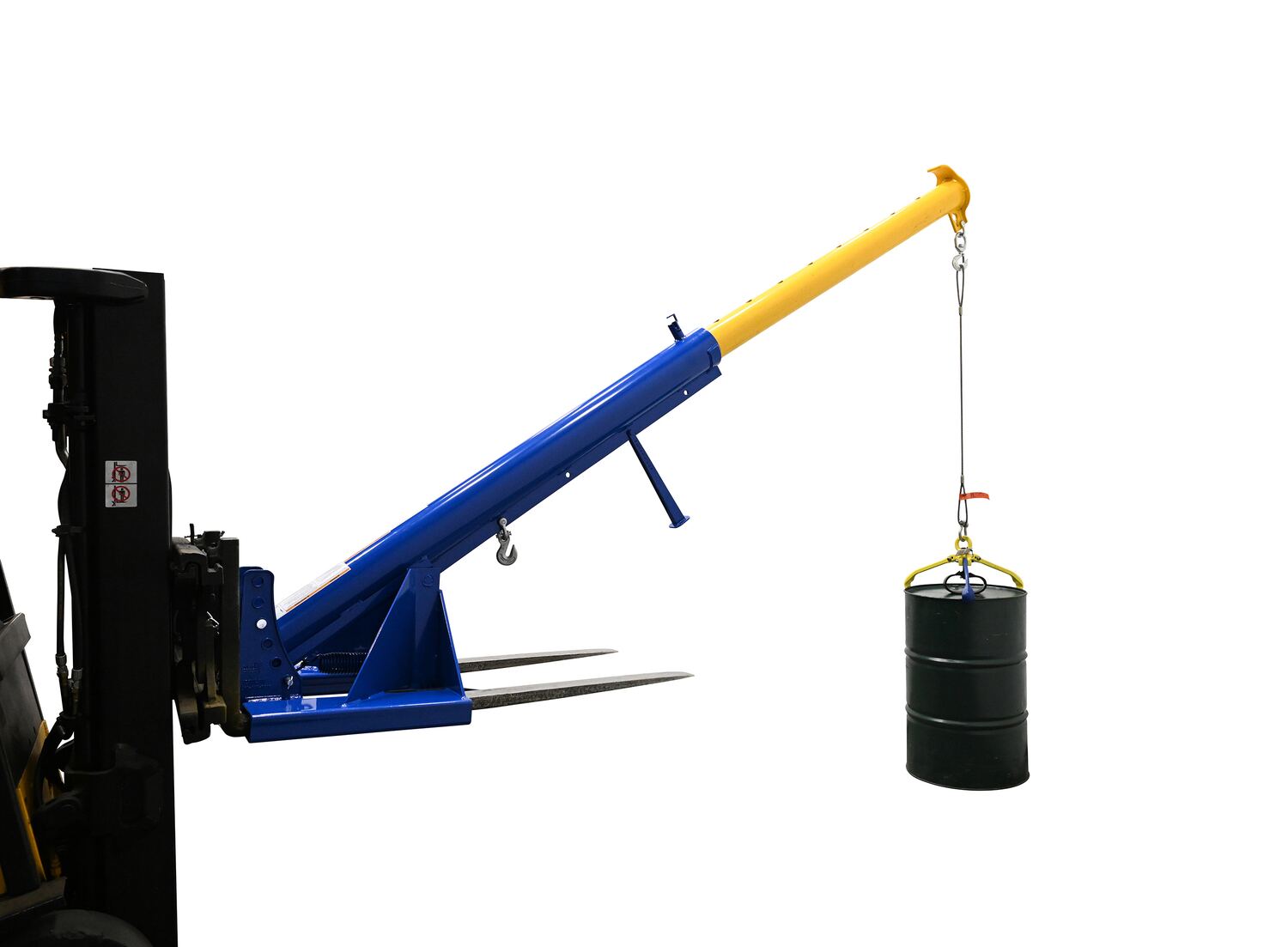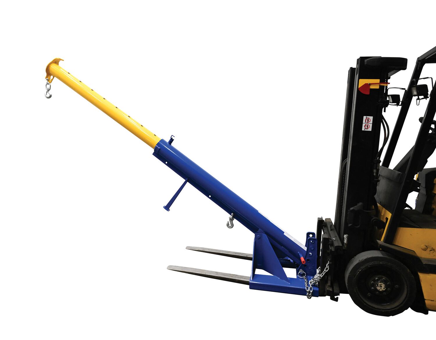 Unique performance, convenience, and safety features are built into every lift master boom. Fabricated from structural steel with welding to meet AWS creates a rugged and durable boom that will provide long term service. This unit features a locking detest. A safety restraint secures the boom to the fork truck for safe operation. Includes two (2) lifting hooks.