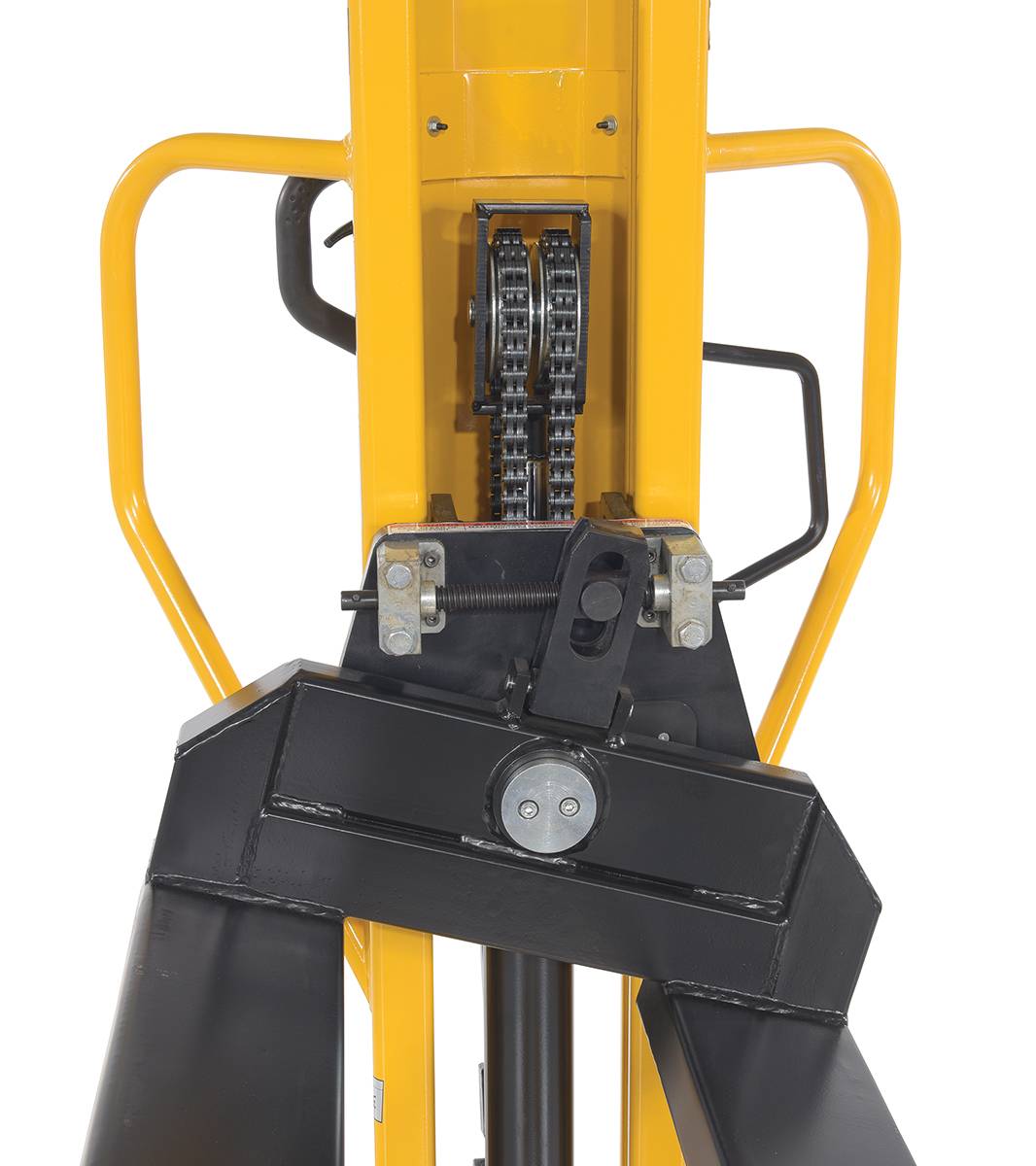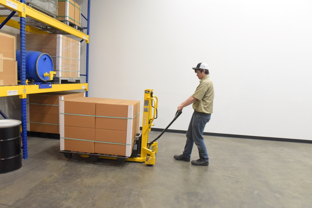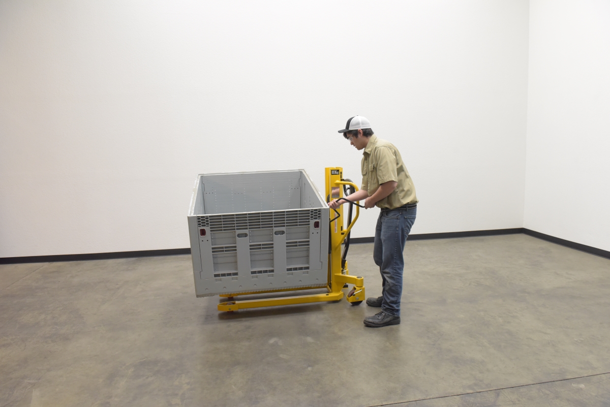 Steel Lift Tilt Truck 21 in x 45 in Forks 1500 lb Capacity Yellow/BlackA lift and tilt pallet truck is an outstanding addition to a variety of production environments. The hand pump lever functionality gives the user control over the precise height movements of the forks. With a wide service range, items both large and small can be loaded and unloaded at a height that best fits the users preference. For items that may need added stability, the tilting function is available. The tilting function can be used up to 20 degrees tilt for extra steadiness. Steel construction with a powder coat finish for added baked in toughness. For use with open bottom pallets and skids only.