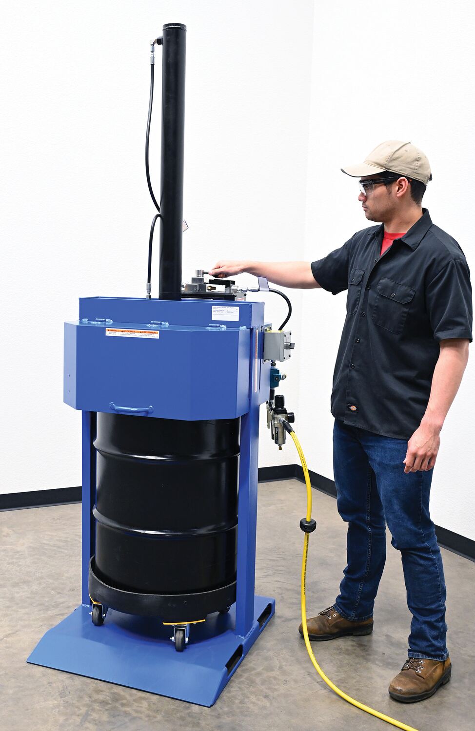 When material needs compacted, look no further than the drum compactor. A simple design with big results, this unit can compact material in a matter of moments. Utilizing a pneumatic input and controls with a hydraulic cylinder, the powerful down force enables the user to reduce the size of material waste. This design is specific for the use with 55 gallon drums. Painted finish minimizes abrasion and provides a smooth surface.