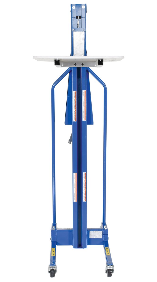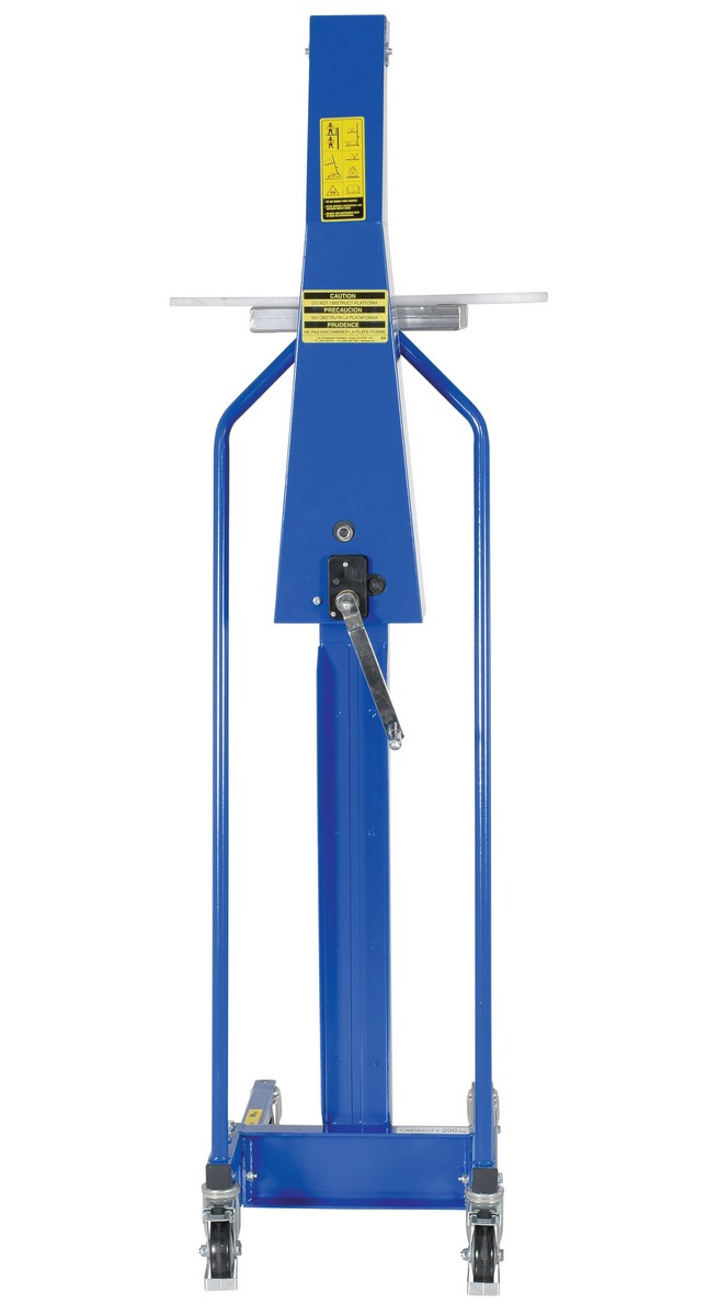 These lightweight lifts are designed to take the strain out of any lifting job. Ideal for use in narrow aisles and confined spaces. Platform height is adjustable with a manual hand winch. An auto brake system allows for controlled lowering. Two (2) 3" swivel load casters and two (2) 5" total locking swivel steering polyurethane casters standard.