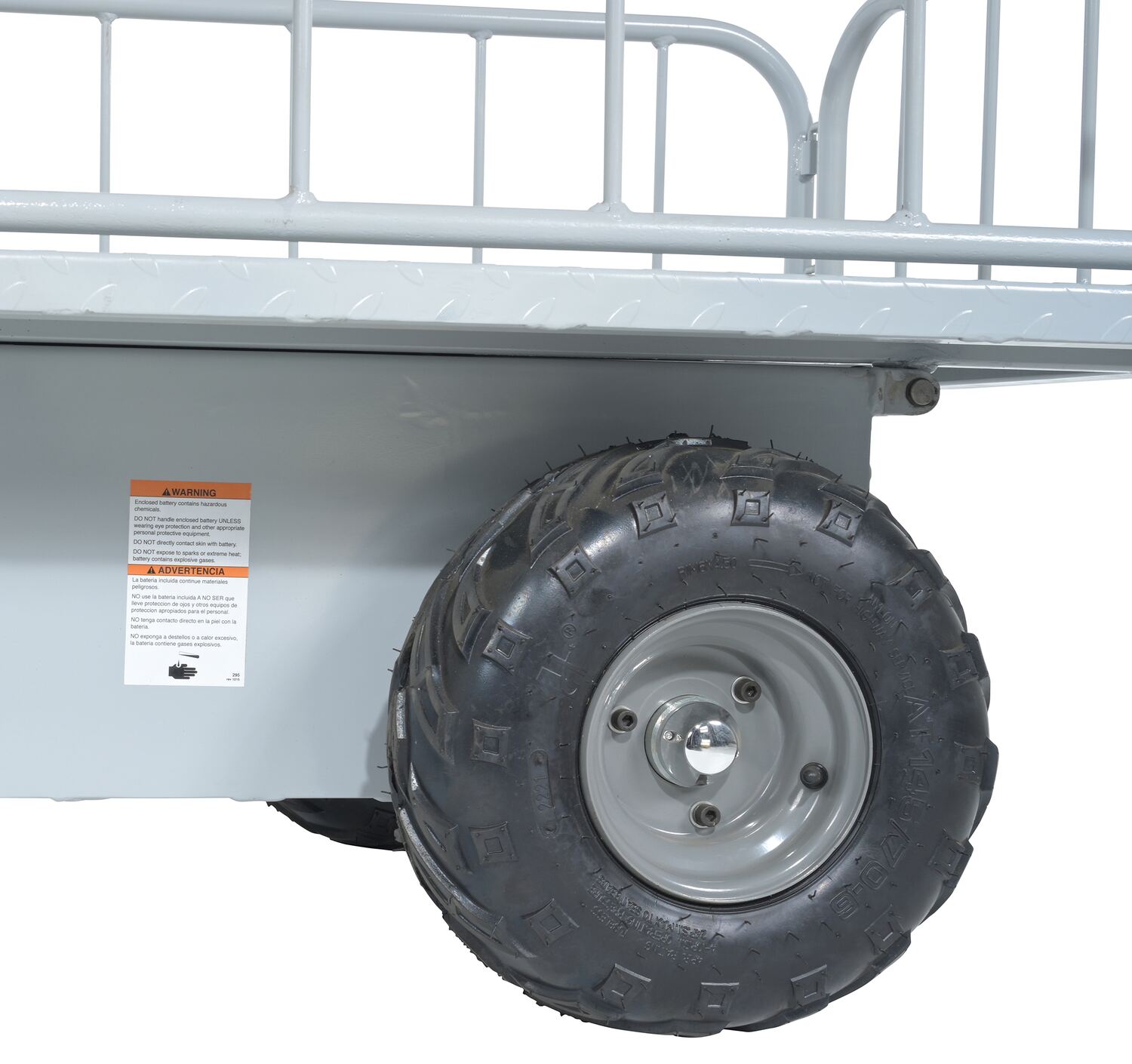 The off-road traction drive powered cart is ideal on the farm or in the factory. Forward/reverse switch. Side guards are removable.