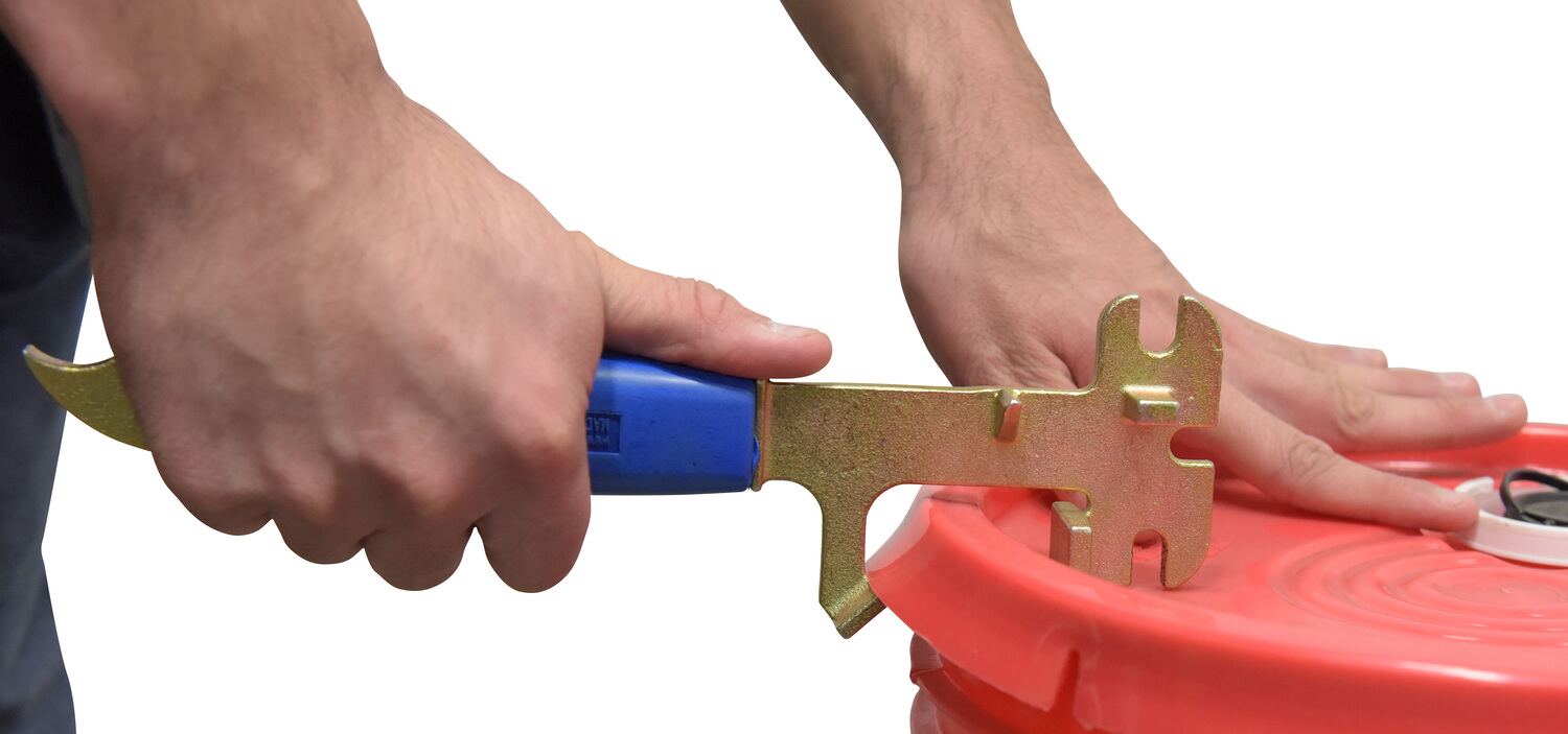 A must-have product for anyone using five gallon plastic and steel pails. The cutter is used to cut a slit in the lid lip of the pail to enable the lid of the plastic pail to be removed. The side guide conveniently slides under the lid lip for easy removal of the lid. The end hook is used to open steel pails. Just hook the lid lip and rotate. The opposite end is used to close and seal the lid by bending the lip back around the steel pail top. Not for UN rated pails.
