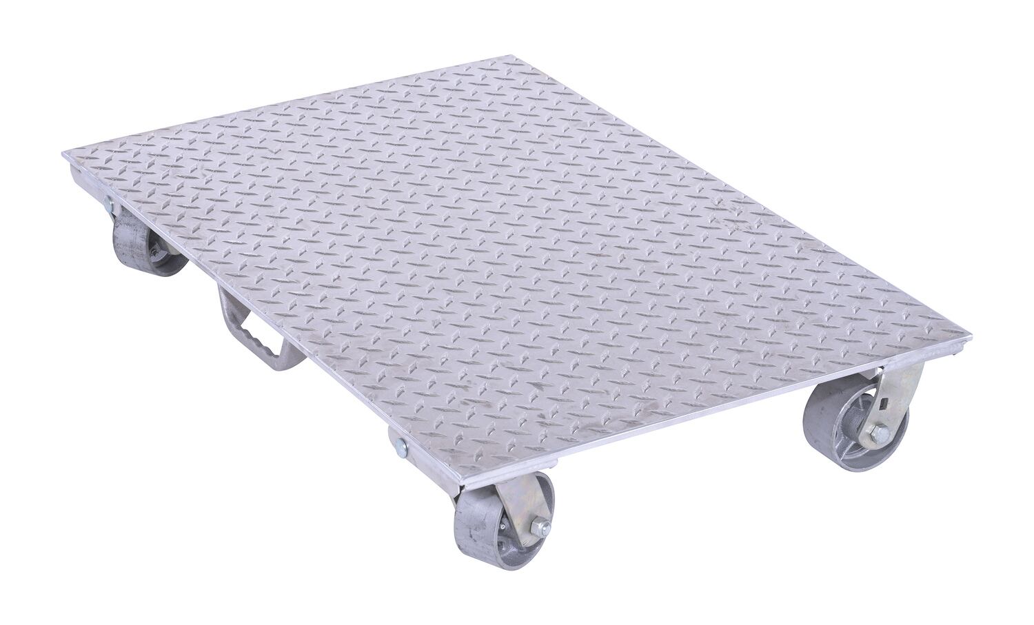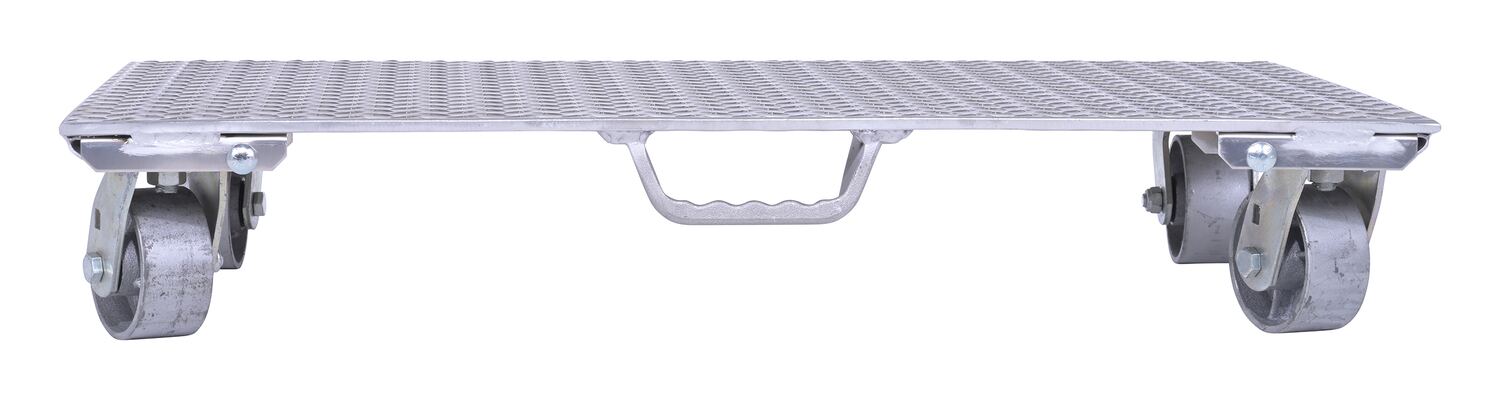 Aluminum Plate Dolly with Cast Steel Wheels and Handle 36 In. x 24 In. x 6 In. 2800 Lb. Capacity SilverThe Aluminum plate dolly is manufactured from heavy-duty raised diamond tread plate for strength and extra grip. Carrying handle is located on bottom side of one end.