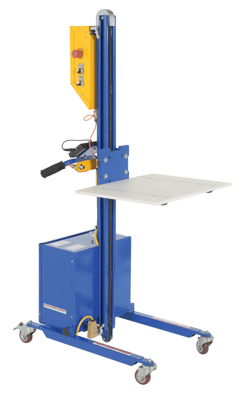 Steel DC Powered Quick Lift with Auto Height Indexer 175lb Capacity BluePowered quick lift units transport and position loads quickly and efficiently. Featuring a low profile design with dual push handles for maneuvering in narrow aisles and confined spaces. The auto height indexer lets the platform be unadjusted to the most suitable height. When unloading many boxes, as one box is taken off of the platform, the height of the platform automatically re-adjusts back to the set proper height. This minimizes bending and keeps the user in a more ergonomic position throughout the process. Unit is powder coated for baked in added toughness.