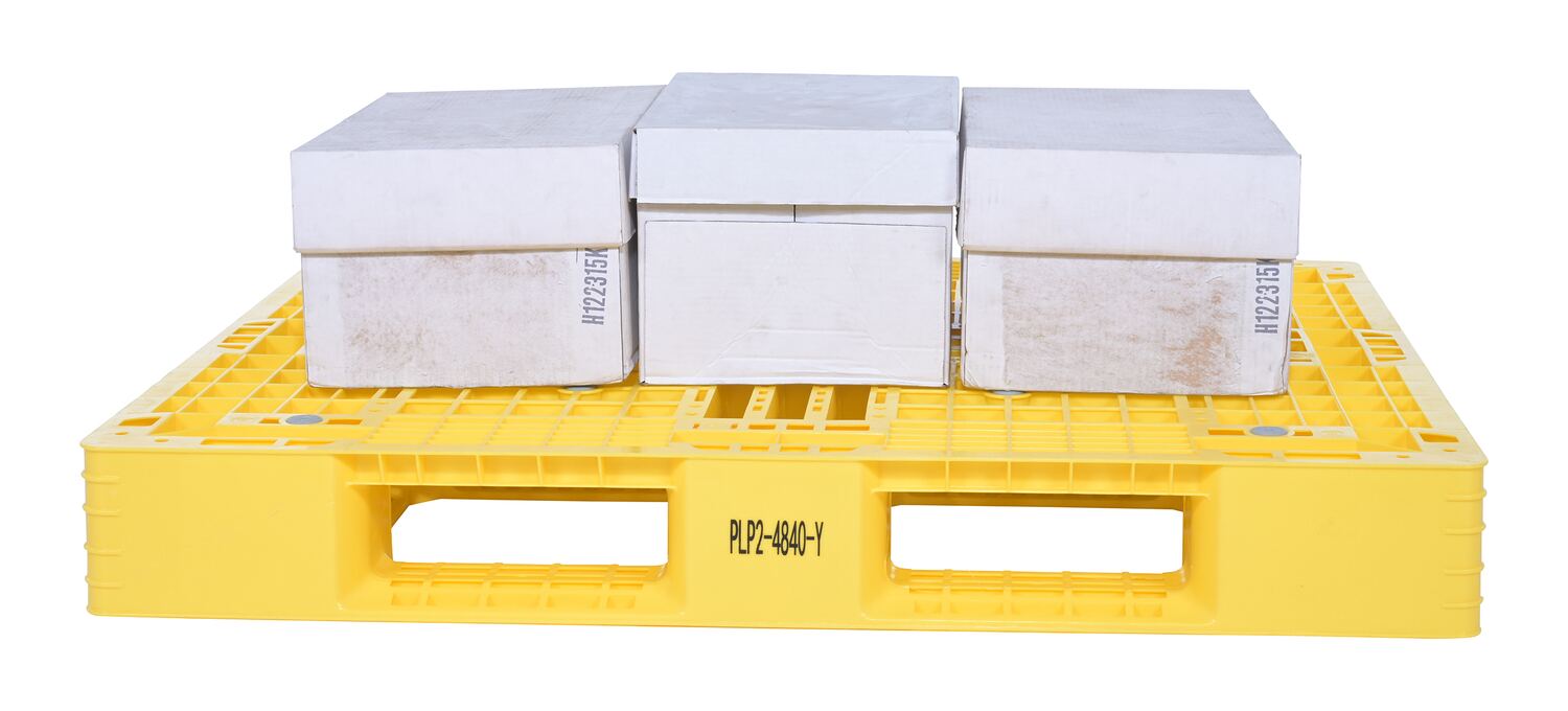 High Density Polyethylene Pallet 39-3/8 In. x 47-3/8 In. x 6 In. 8000 Lb. Capacity YellowPlastic pallets are stackable for efficient storage. Made of high-density virgin polyethylene for long life. Plastic pallets are maintenance free and safer to handle than wooden pallets. Features a four-way entry and serrated deck with holes for drainage. Plastic pallets are ideal for export, pharmaceutical, medical, and food applications.