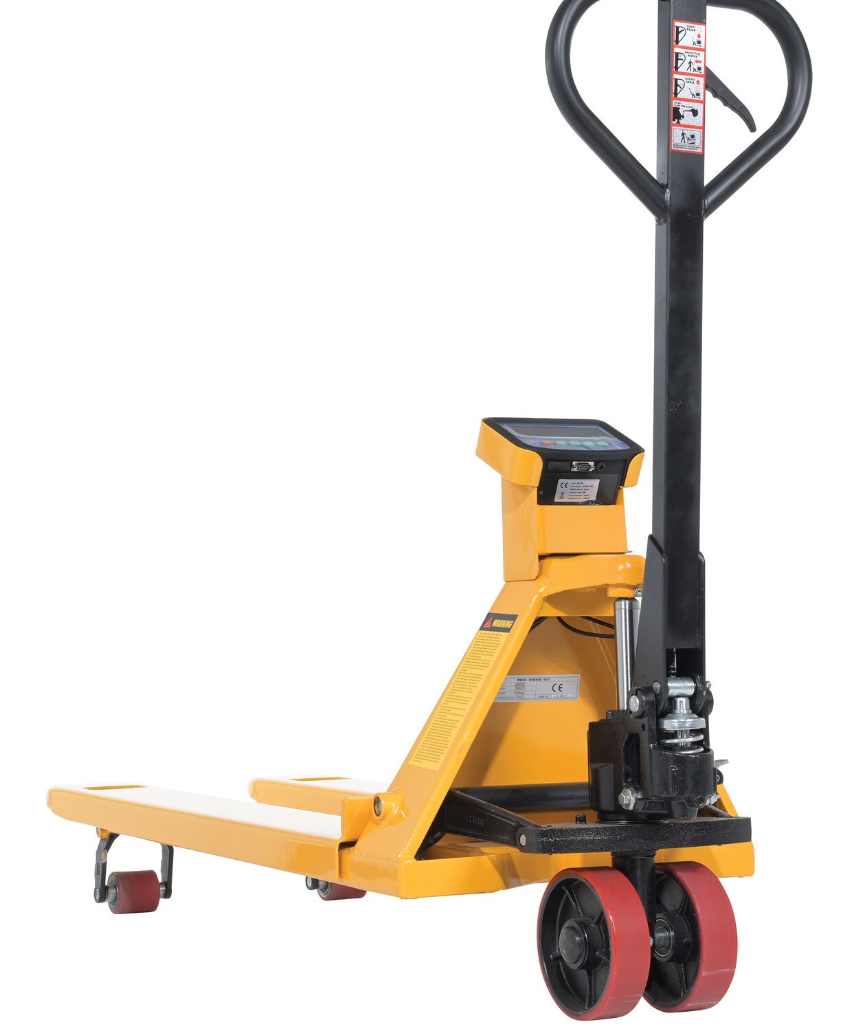 A low profile pallet truck is an economical way for one person to move heavy pallet loads without the use of a fork truck. With a scale included, items can be weighed and moved all in one unit. This brings efficiencies to warehouses and shipping areas, while bypassing the traditional time consuming weigh areas. The casters (two steer and four rollers) give the pallet truck quick movement and smooth turn-ability. The forks are built of steel and are powder coated yellow.