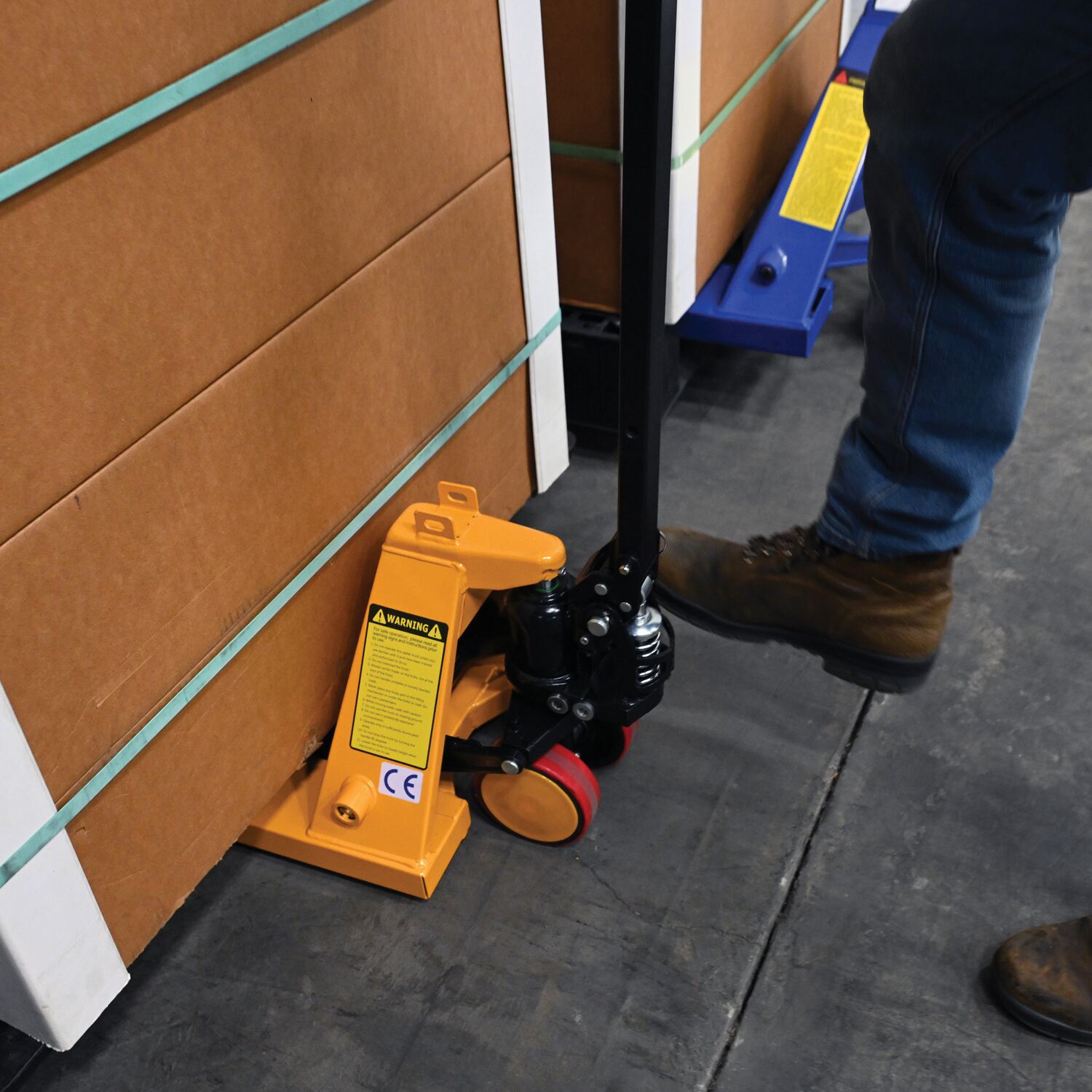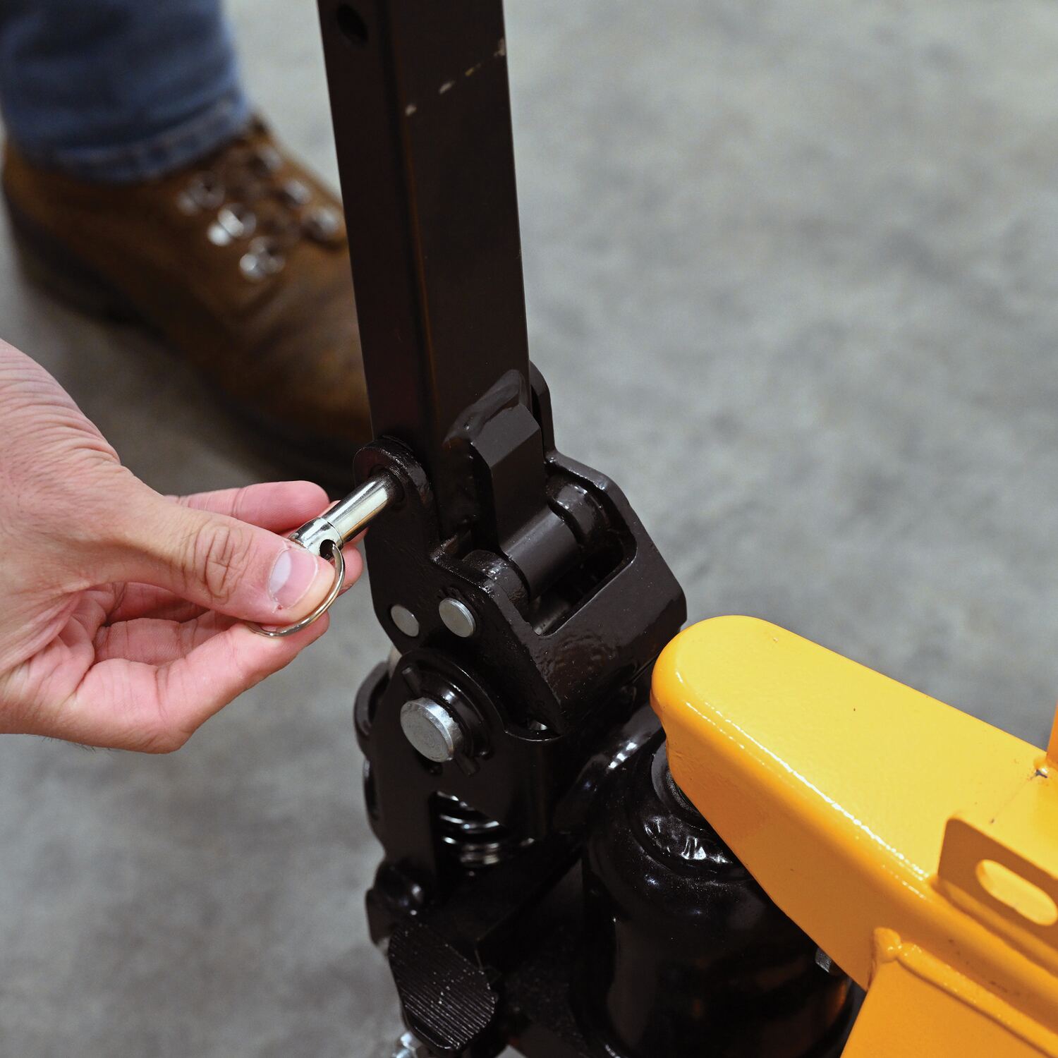Steel Mini Hand Pallet Truck Fold Down 45 In. x 15 In. x 45 In. 1100 Lb. Capacity YellowJust when it seemed the mini pallet truck couldn't get any smaller, they found a way to make it even more compact! At first glance the overall design may appear to be unchanged, but the features are hidden in plain sight. Not only does the handle now fold down, but the fork tips fold up and back. To better secure the handle in the down position, pre-drilled mounting holes are provided to connect the handle to a welded on bracket. While some things have changed, the always dependable powder coated steel construction has remained. With floor space continuously at a premium, the mini pallet truck is destined to be any facilities go-to pallet truck!