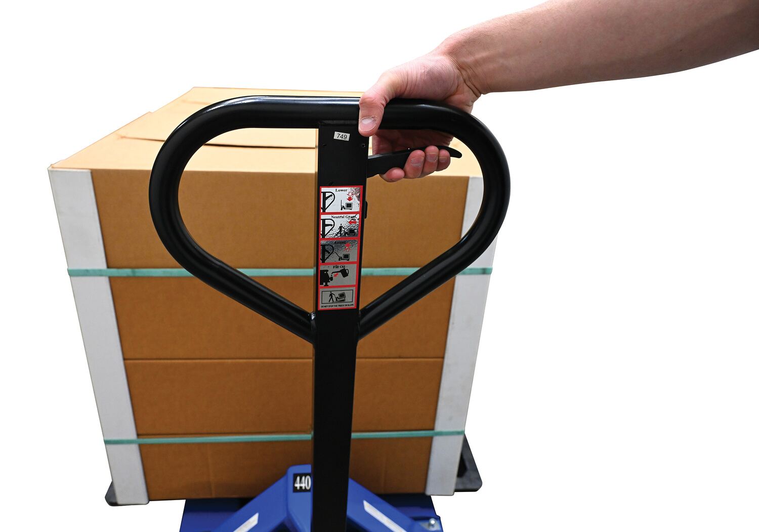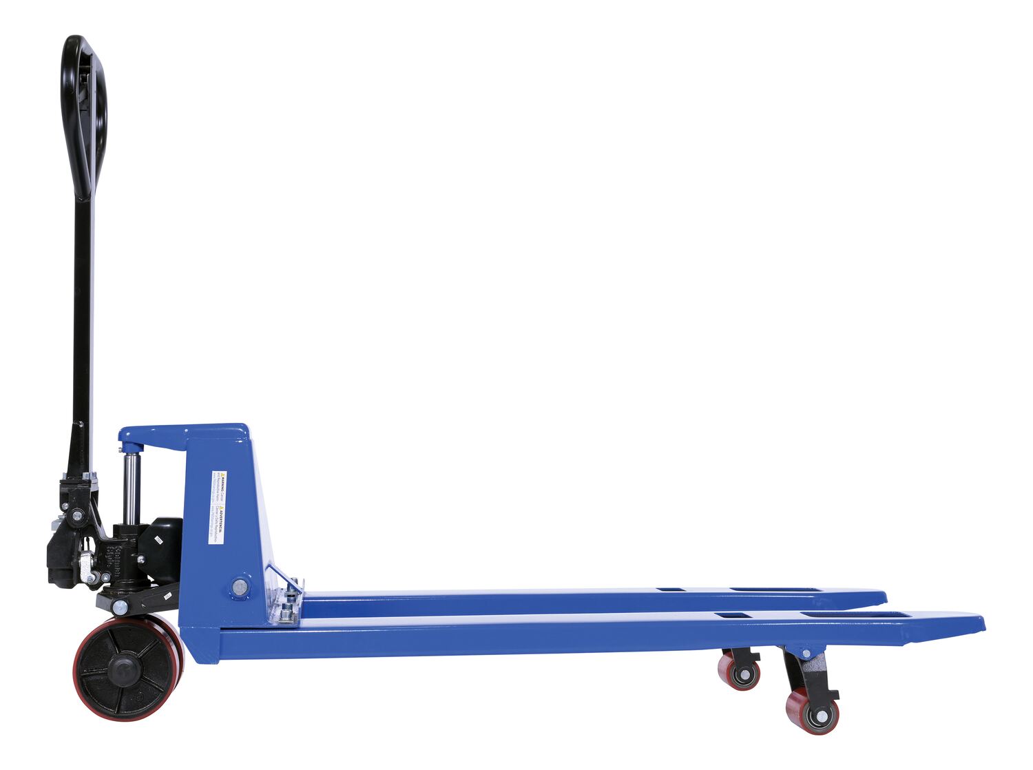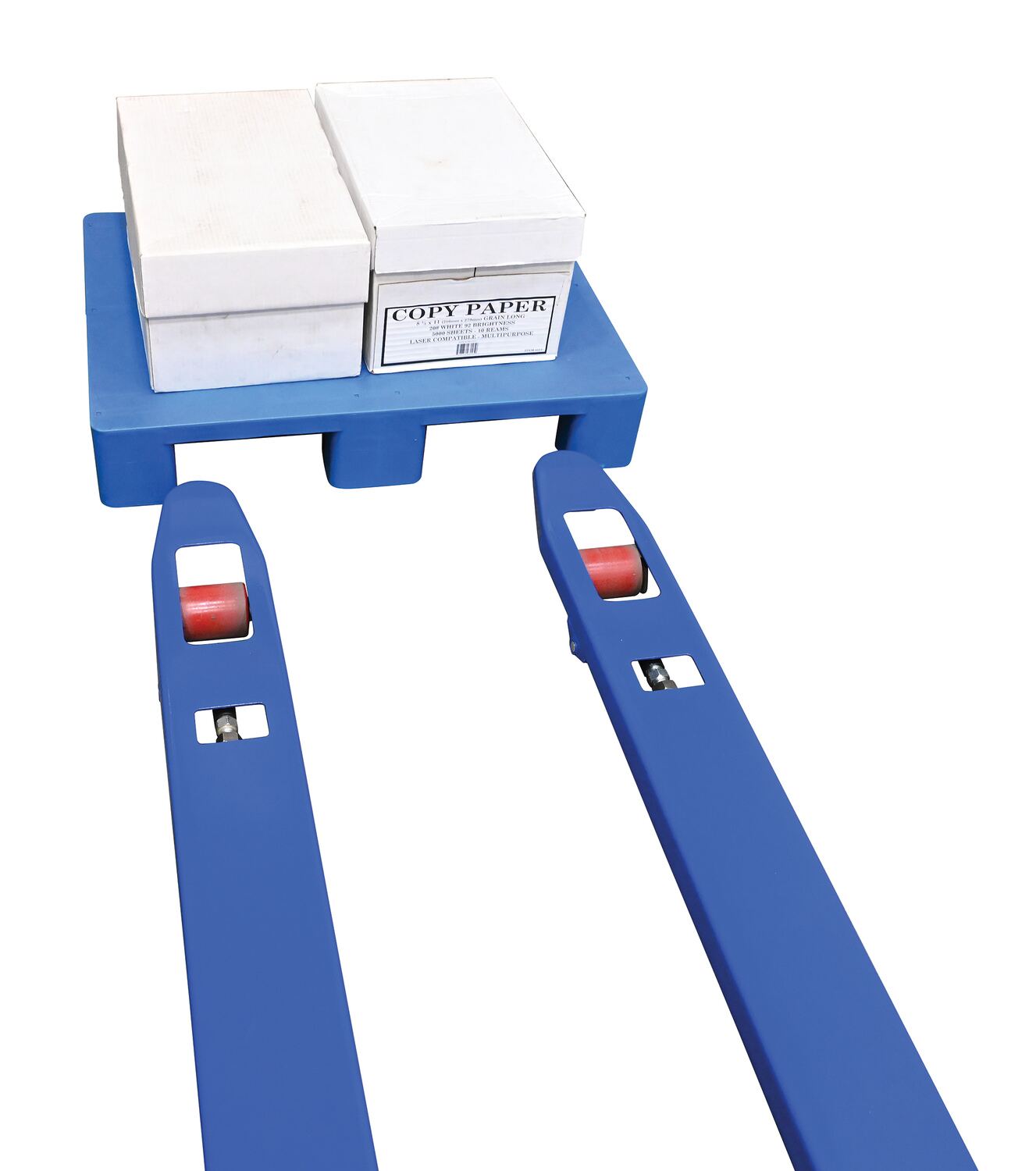 Steel Pallet Truck 48 In. Long 21 In. -27 In. Adjustable Width Forks 4,400 Lb. Capacity BlueA hydraulic pallet truck with adjustable forks makes moving heavy loads a simple task. The open design is also excellent for performing any preventative maintenance, with all parts being easily accessible. With a robust steel frame and a unique chassis assembly, this pallet truck is built to last! A hydraulic hand pump mechanism makes the lifting and lowering process, quick and easy. To limit abrasions or scratches the truck is finished with a durable baked in powder coat.