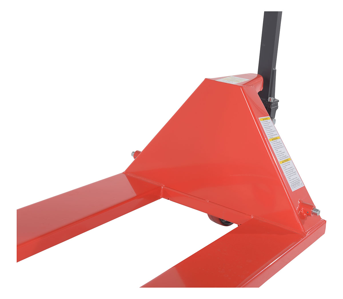Steel Pallet Truck 61-11/16 In. x 27 In. x 48-5/8 In. 5500 Lb. Capacity RedThe full featured pallet truck is an economical way for one person to move heavy pallet loads without the use of a fork truck! Includes two (2) articulating steering wheels and two (2) front load rollers. The ergonomic design requires only seventy-five (75) pounds of pulling force when fully loaded. Steering wheels include bearing dust covers for added life. Nose wheels are located on the front edge of each fork to assist in clean pallet entrance and exit. Reinforced triple-formed steel forks provide twice the strength of standard single-formed forks. The unit is equipped with internally mounted solid steel adjustable push rods. The spring loaded handle automatically returns to vertical position when not in use. Hydraulic pump design facilitates easy-access seal replacement. Chrome-plated hydraulic pump piston for long seal life.