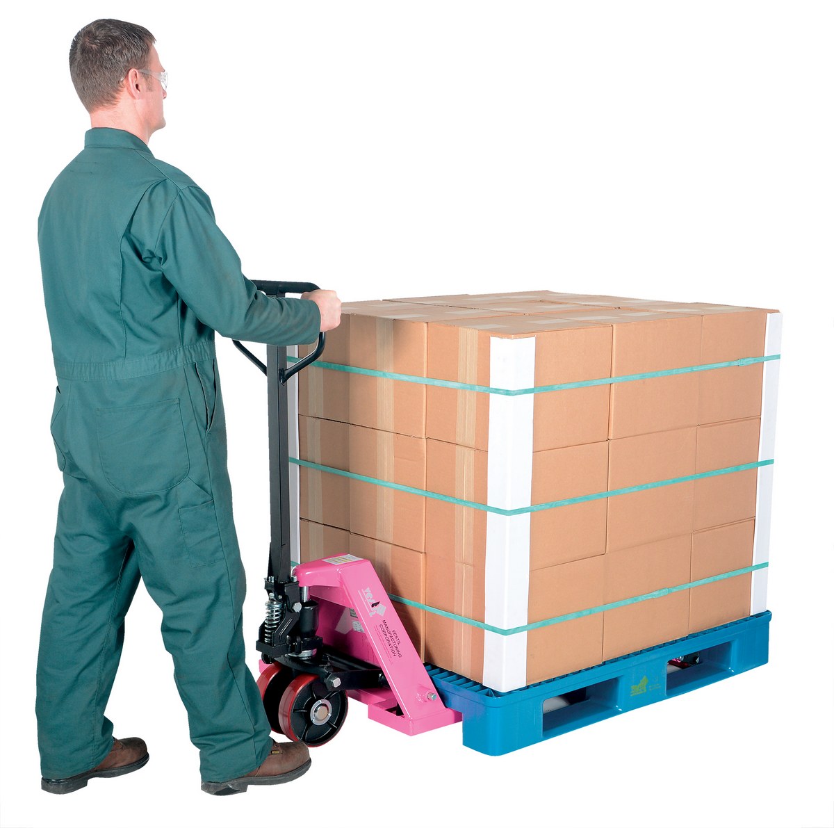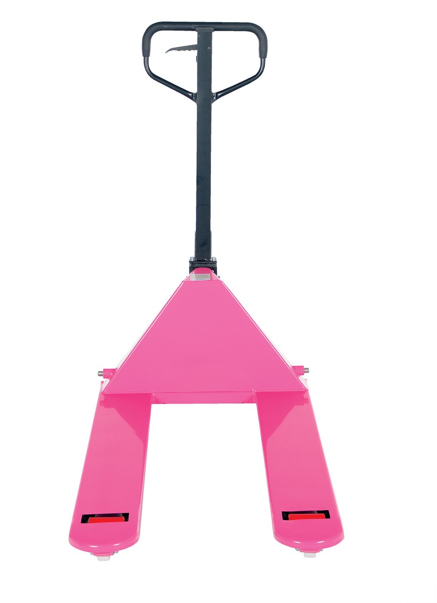 Steel Pallet Truck 63 In.x 27 In. x 48 In. 5500 Lb. Capacity PinkThe full featured pallet truck is an economical way for one person to move heavy pallet loads without the use of a fork truck! Includes two (2) articulating steering wheels and two (2) front load rollers. The ergonomic design requires only seventy-five (75) pounds of pulling force when fully loaded. Steering wheels include bearing dust covers for added life. Nose wheels are located on the front edge of each fork to assist in clean pallet entrance and exit. Reinforced triple-formed steel forks provide twice the strength of standard single-formed forks. The unit is equipped with internally mounted solid steel adjustable push rods. The spring loaded handle automatically returns to vertical position when not in use. Hydraulic pump design facilitates easy-access seal replacement. Chrome-plated hydraulic pump piston for long seal life.