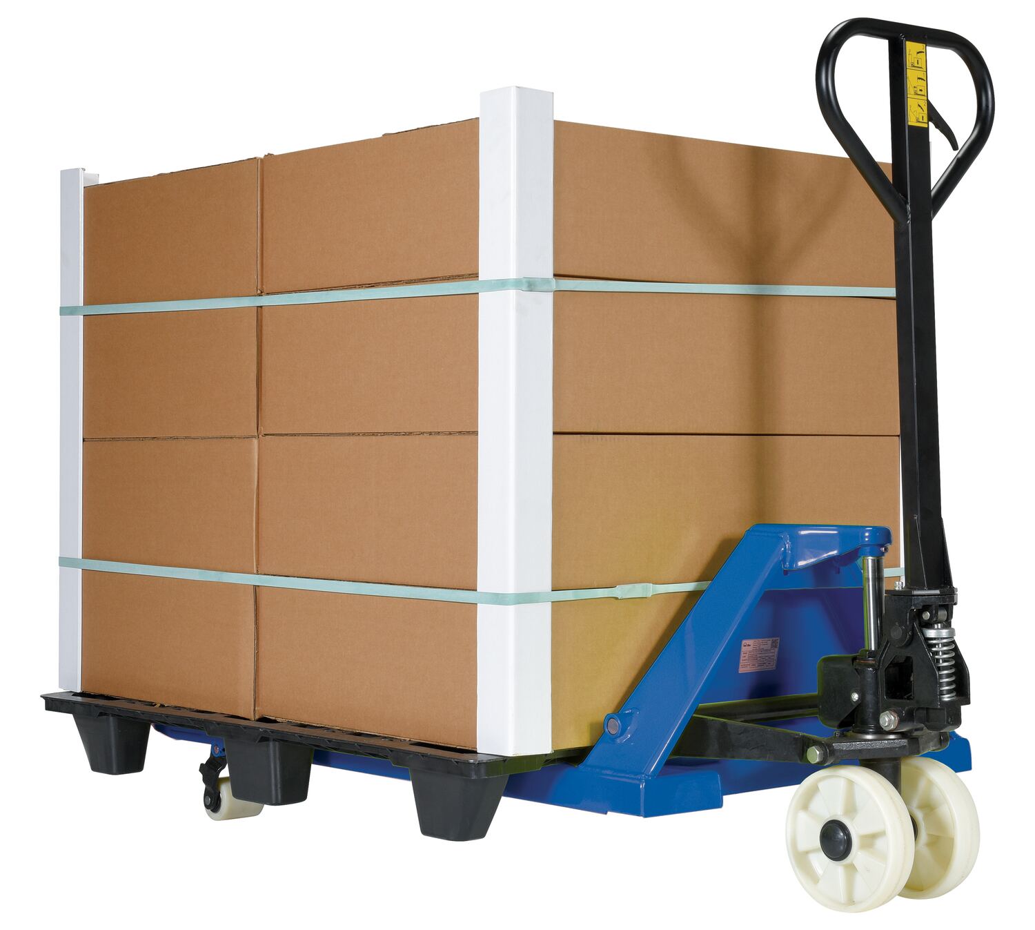 Easy to maneuver in tight spaces. Offers a combination of light frame and rollers with self-lubricating ball bearings. Handle is ergonomically designed for operator comfort, reducing lifting and rolling effort. Supplemental rollers allow an easier entrance and a quicker exit from the closed pallets. Features robotic ally welded frames for consistent strength. Individual fork width is 6".