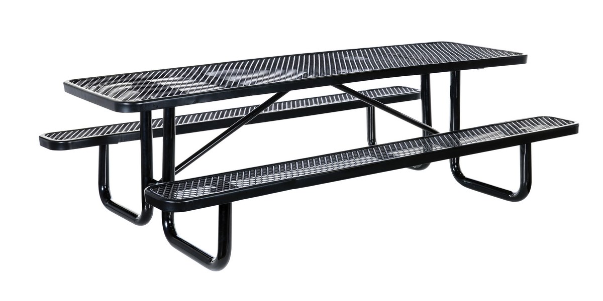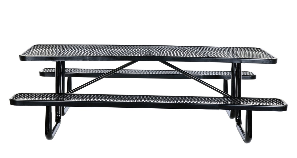 Steel Picnic Table Expanded Metal Rectangle Top 30 In. x 96 In. BlackBuilt to last and highly attractive, this commercial grade metal picnic table is constructed of expanded metal that features a diamond pattern. Finished to endure the elements with virtually no maintenance. Tops and seats are coated with a rugged thermoplastic layer that's attractive and durable. Galvanized tubular steel legs and supports are protected with a black powder coat finish designed for strength and stability.