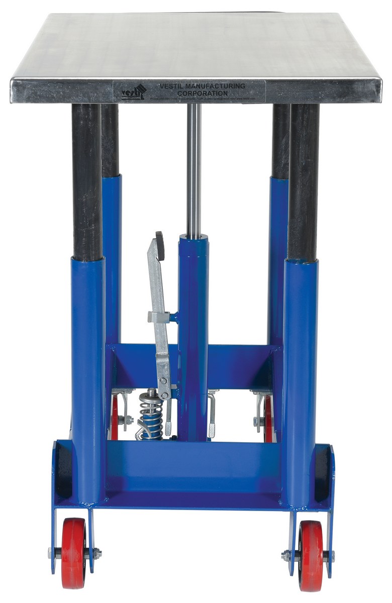 Steel Low Profile Post Lift Table 41 In. x 24 In. x 25 In. 4000 Lb. Capacity BlueHydraulic post tables are ideal in material handling facilities. The unit can be of use in a variety of environments from lifting dies and castings to moving machine parts. The corner posts are telescoping to help stabilize and fully support the load during operation. The tables roll smoothly on two (2) locking swivel casters with brakes and two (2) rigid. The tables can be lifted/lowered with a single speed foot pump, two-speed foot pump, two speed auto shifter that automatically shifts when the table is loaded, or linear actuated power.