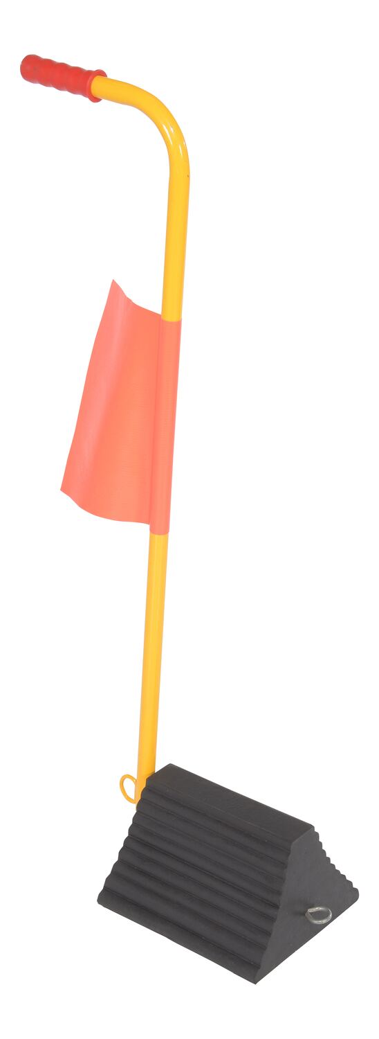 Rubber Wheel Chock With Handle and Flag 12 In.The ergo-handle Wheel Chock has an ergonomic design that makes it easy to move wheel chocks in and out of position under trailer wheels. It reduces the risk of back, knee, and foot injuries. The handle is constructed of steel and has a yellow powder coat finish. Hardware included. Assembly required. D-ring provided for attaching security chain. A vinyl flag is included to provide added visibility and awareness to the chock. Chain not included.