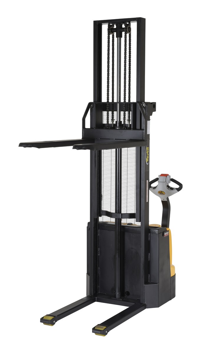 Steel Fixed Forks Double Mast Stacker 118 In. Raised Height 2200 Lb. Capacity Black / YellowDouble mast fully powered electric stacker transports loads throughout warehouse facilities quickly and with less effort. High torque drive and lift motor handles heavy-duty jobs. Ergonomic handle features easy-to-operate throttle with infinite adjustment of forward and reverse speeds, lift/lower controls, proprietary safety-enhancing emergency reverse function, and horn. Includes an electromagnetic disc brake with automatic dead-man feature that activates when user releases the handle. Powered lifter has two lead acid deep cycle batteries. .A battery charger, gauge and horn are included. Stacker rolls smoothly on poly-on-steel steer and load wheels. 3-4 hour operation at full charge - 8 hours when used intermittently.