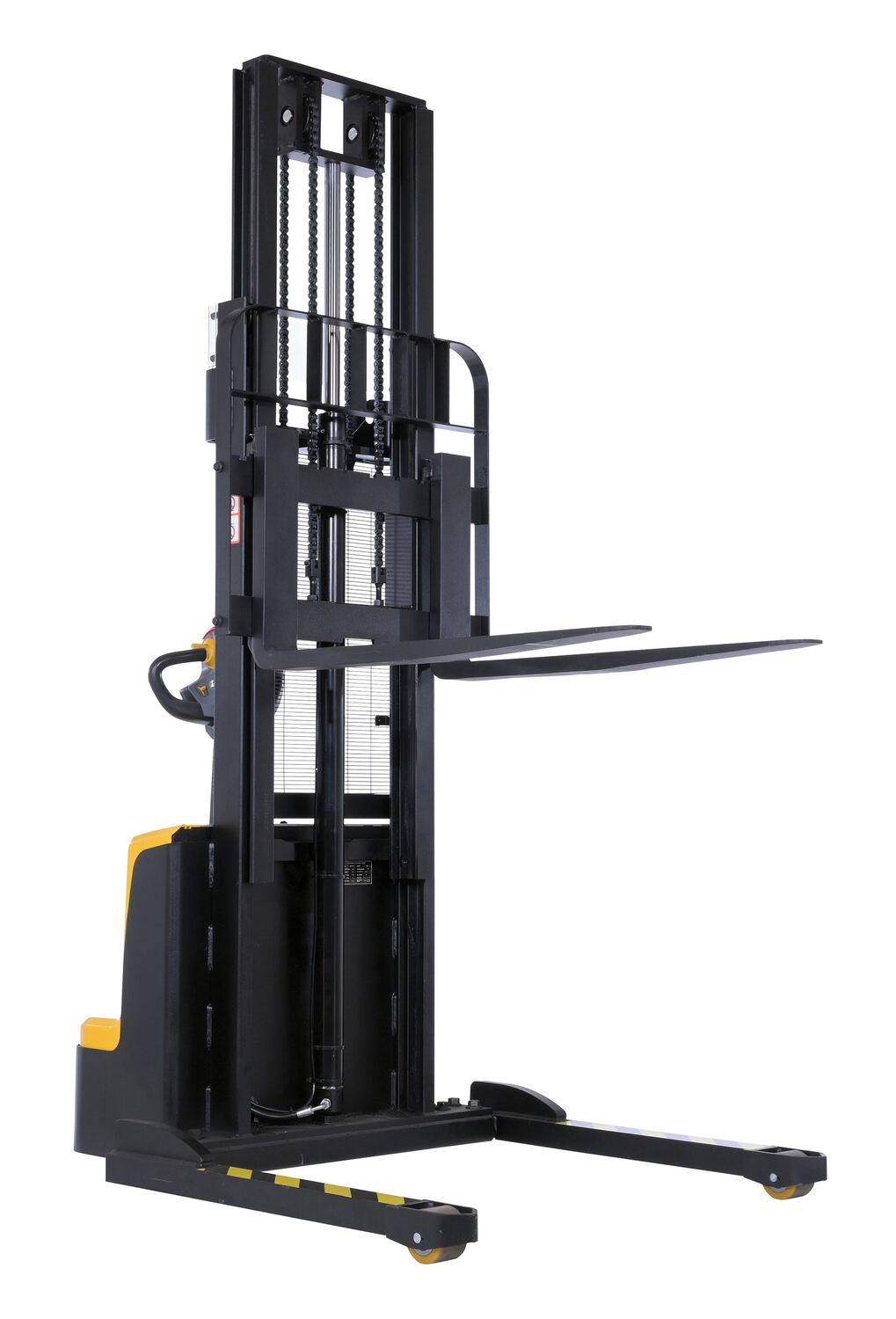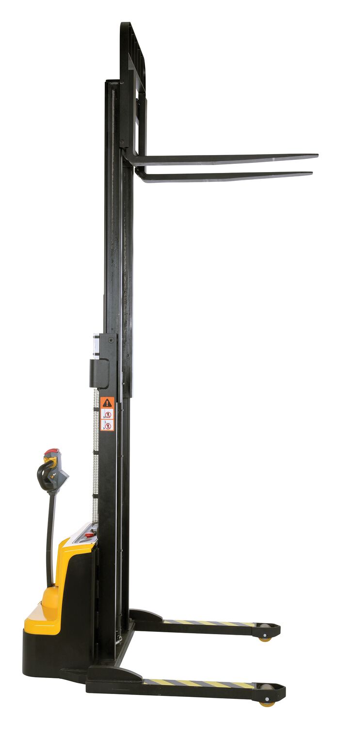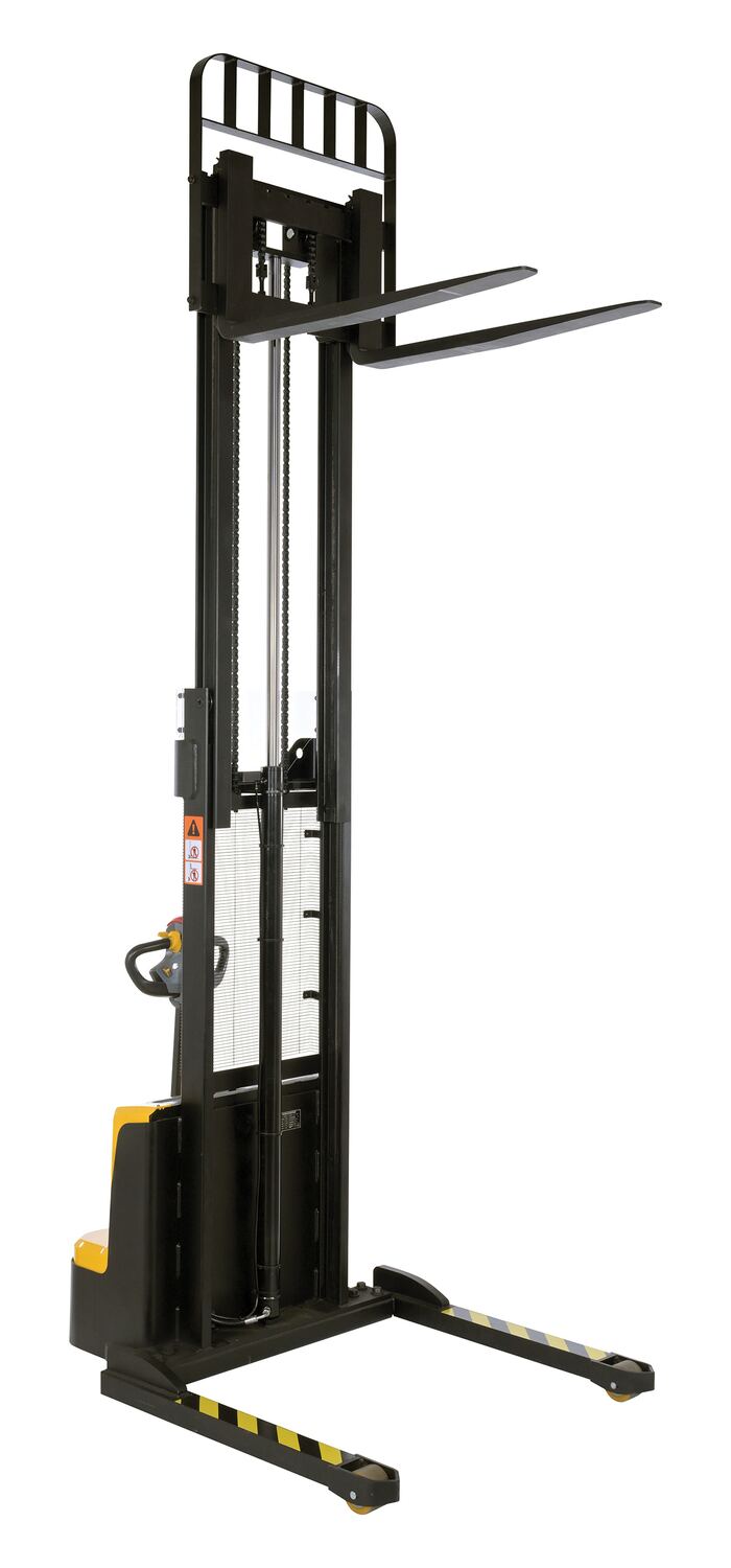 Steel Adjustable Double Mast Stacker 118 In. Raised Height Variable Speed 2200 Lb. Capacity BlackThe double mast fully powered electric stacker transports loads throughout warehouse facilities quickly and with less effort. High torque drive and lift motor handles heavy duty jobs. Ergonomic handle features lift/lower controls, proprietary safety enhancing emergency reverse function, and horn. The unit includes an electromagnetic disc brake with automatic dead-man feature. Powered lifter has two 12V lead acid deep cycle batteries, integral battery charger, and a battery level gauge.