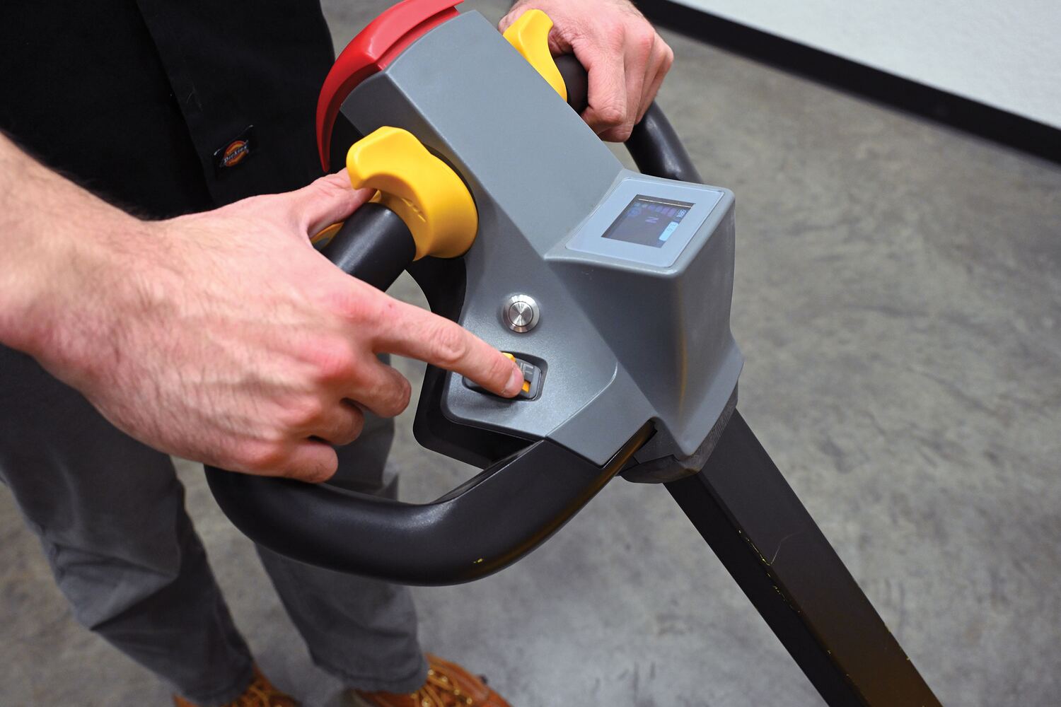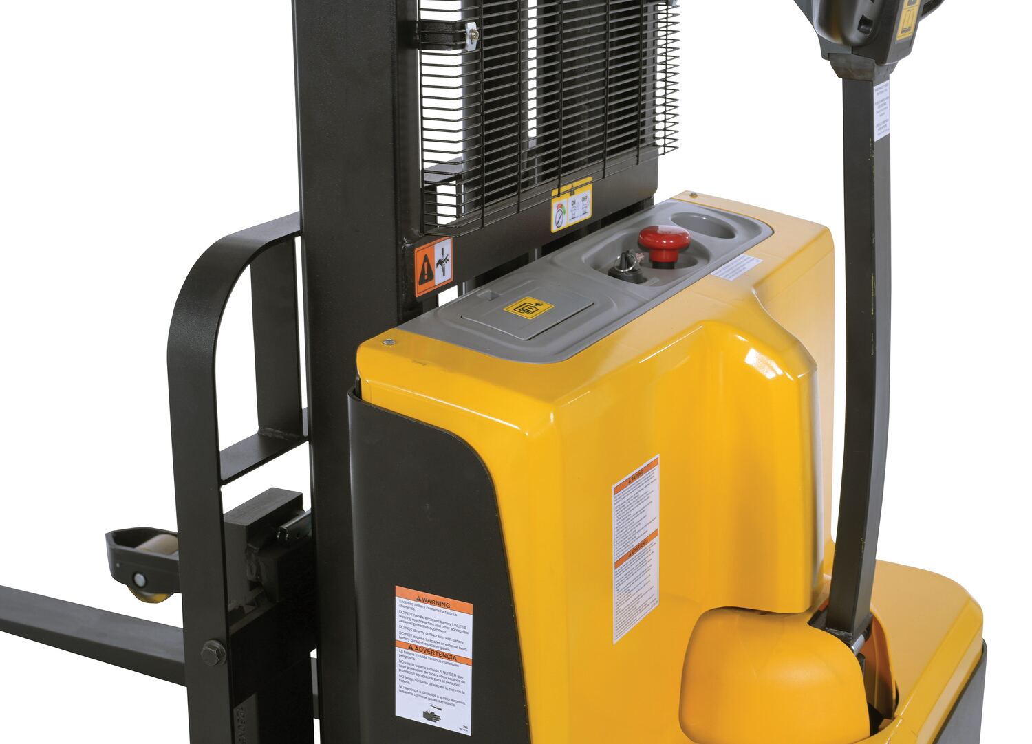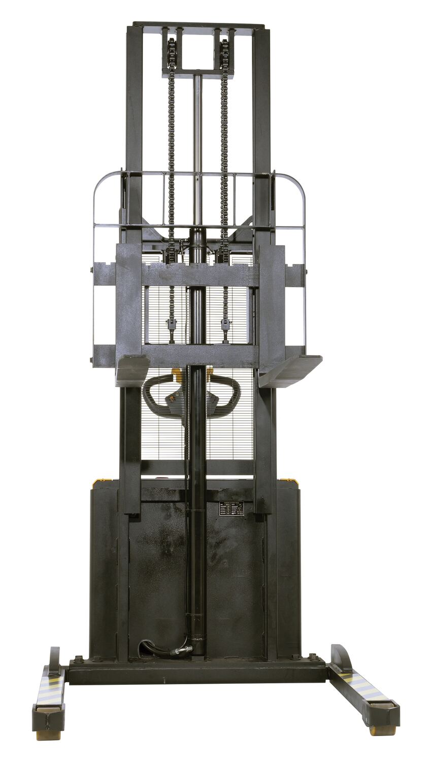 Steel Adjustable Double Mast Stacker 118 In. Raised Height Variable Speed 2200 Lb. Capacity BlackThe double mast fully powered electric stacker transports loads throughout warehouse facilities quickly and with less effort. High torque drive and lift motor handles heavy duty jobs. Ergonomic handle features lift/lower controls, proprietary safety enhancing emergency reverse function, and horn. The unit includes an electromagnetic disc brake with automatic dead-man feature. Powered lifter has two 12V lead acid deep cycle batteries, integral battery charger, and a battery level gauge.